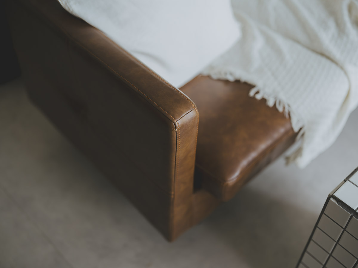 寝室としている別室には、LOOSY の一人掛けソファとメルカリで見つけたペルシャ絨毯で空間をコーディネート。