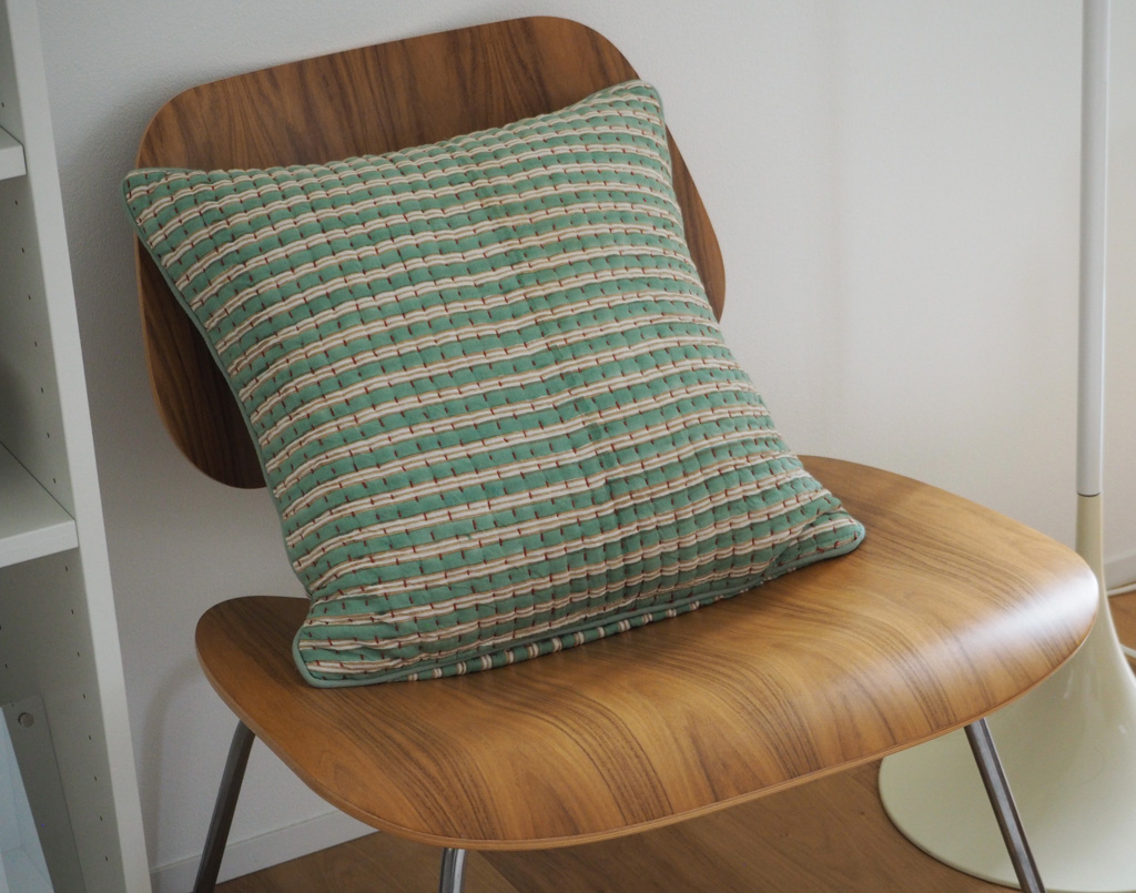 最後はクッションカバー。赤い刺繍でステッチが入っていてアクセントになっているところがとても気に入っています。