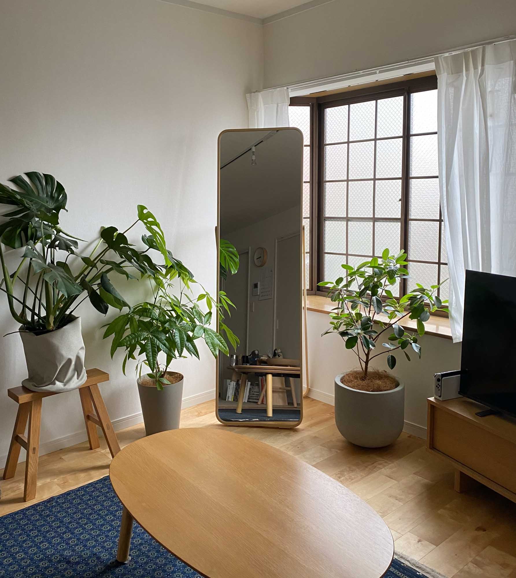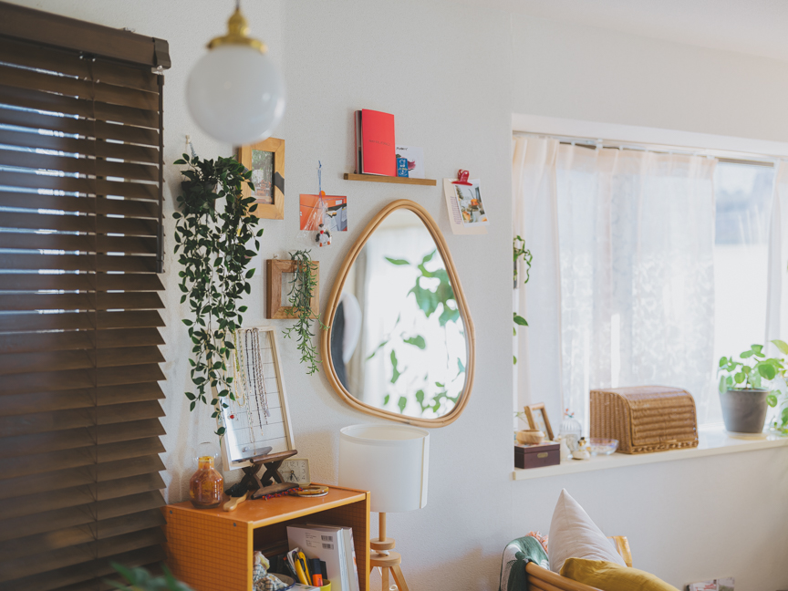 「この住まいは、独立洗面台がないため、身支度のための鏡が生活上どうしても必要でした。壁掛けできて、できるだけ大きなものをと探していた中で、よく利用するIKEAで見つけたのがこの鏡です。ラタン素材は他のインテリアとの統一感もあって、一択でした」(このお部屋はこちら)