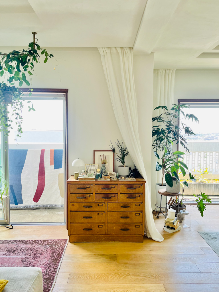 「表情のあるクラッシュリネンの生地感と、しっかりした長さがお気に入り。淡く光を通す感じも、天井からの流れるような落ち感もすべてがイメージ通りでした」(このお部屋はこちら)