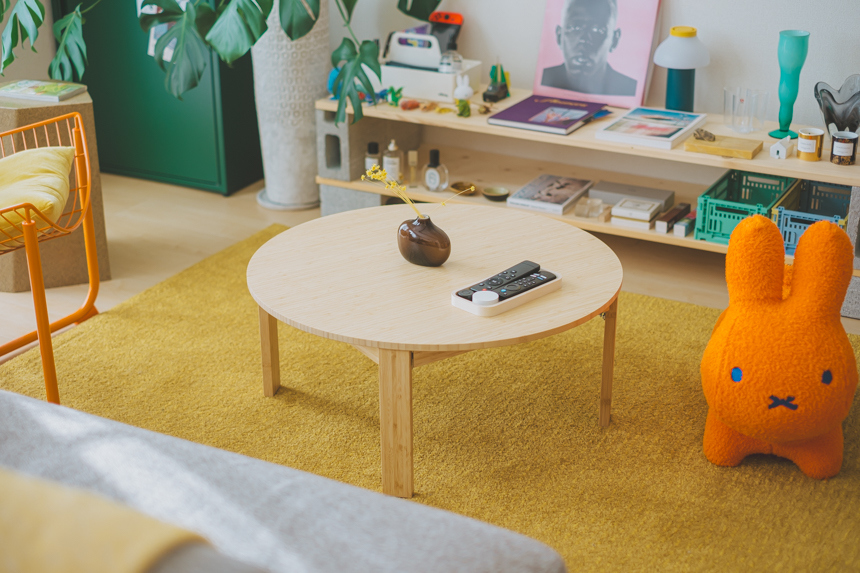 洋室にも和室にも似合う、ちゃぶ台のようなデザインの丸テーブル。脚は折りたたみ式なので、来客のときにだけさっと出すテーブルとしても便利です。(このお部屋はこちら)