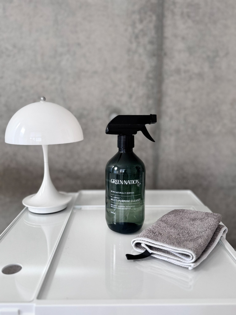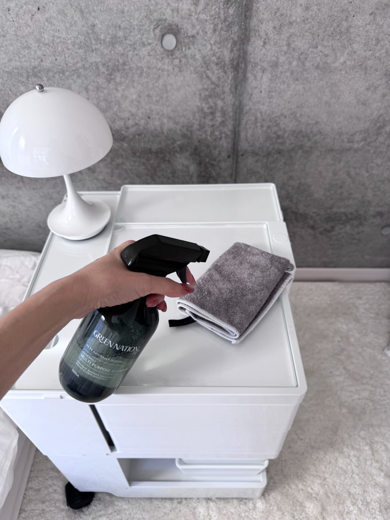 まずお掃除用品として愛用しているのがこちらのマルチクリーナー。99.9%天然由来成分で、2度拭き不要。100%ピュアエッセンシャル配合の心地良い香りと、クリーナーとは思えないルックスが気に入っています。サッと手に取りやすい場所に置いて、家中の掃除に安心して使っています。