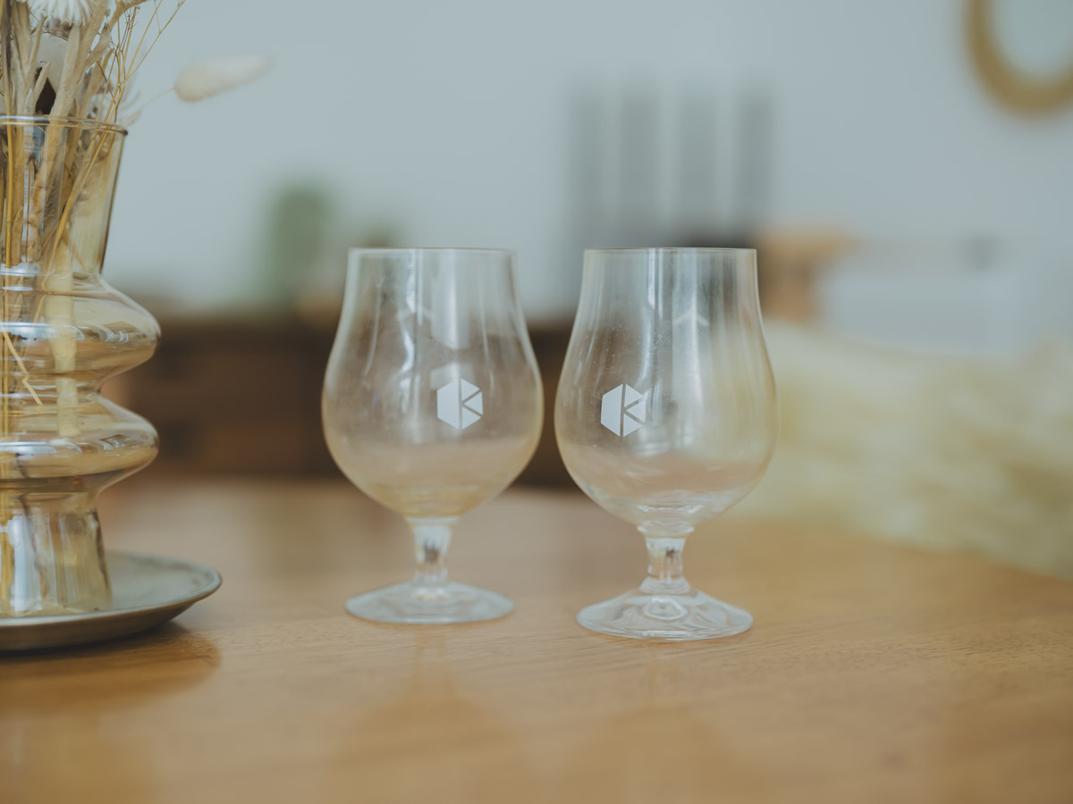 夫婦共通の趣味であるビールを楽しむための「京都醸造のビールグラス」は、割ってしまった時に買い直したほどのお気に入り。直径が広めで、グラスの中にたまった香りをたっぷりと楽しみながら飲むことができます。(このお部屋はこちら)