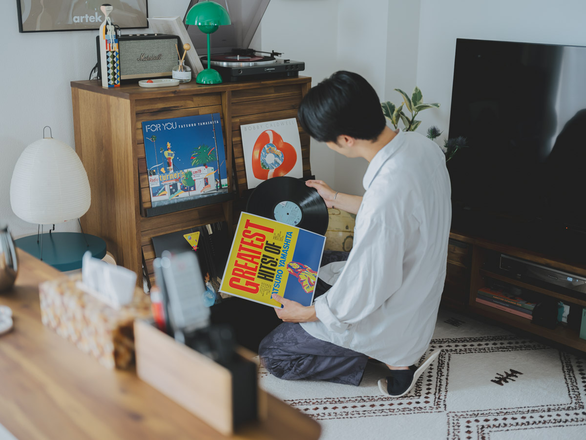 unicoのSWELLAシリーズが好きで、AVボードから始まり、ダイニングテーブル、レコードラックと揃えていったというお部屋。特にレコードラックはお気に入り。ラックにはレコードを立てかけられるスペースがあり、「好きなレコードをここに並べるのが幸せな時間」と話します。(このお部屋はこちら)