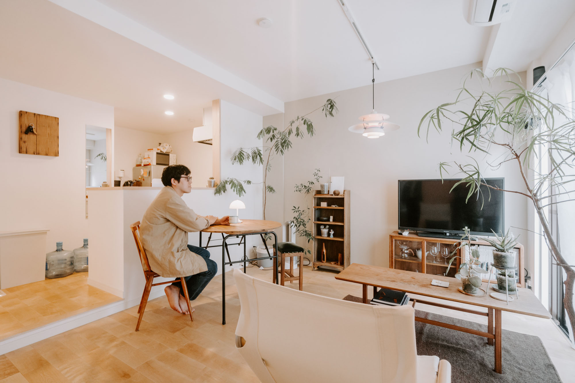 しゅんさんが一人暮らしをしていらっしゃるのは、43㎡ほどの1LDK。こだわって選んだ北欧ヴィンテージの家具と、たくさんのグリーンに囲まれたリビングダイニング。絶妙なバランス感覚で、ほっと落ち着ける空間をつくっていらっしゃいます。