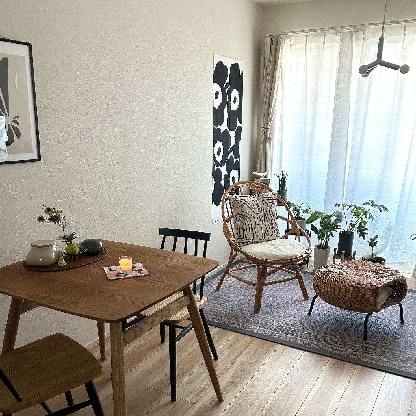 junさんが二人暮らしをしていらっしゃるのは、築9年ほどの2LDK。たくさんのグリーンと、ナチュラルな家具でまとめた、リビングダイニングは、生活感をほどよく隠しながら、落ち着いてすごせる空間です。