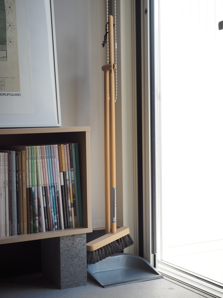 OLYMPUS DIGITAL CAMERAブラシとチリトリがセットになっている掃除用具。チリトリ側の持ち手にブラシをはめ込んで置いておけるので、一緒に収納できてとても便利です。出しっぱなしで置いておけるので、土間が汚れていたらサッと気軽に手にとって掃除ができるようになり、空間を綺麗に保てられるようになりました。(このお部屋はこちら)