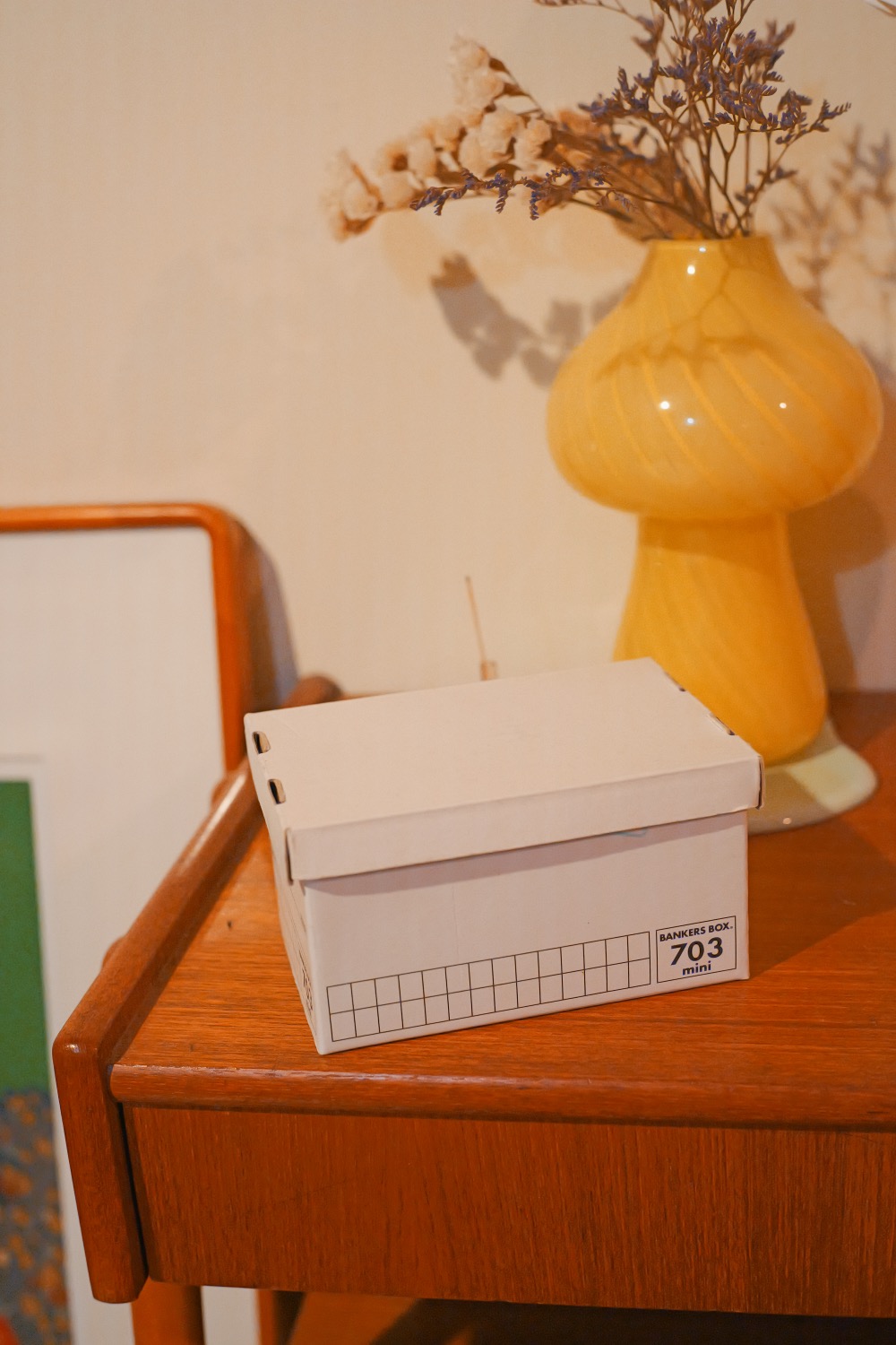 人気の収納ケース「フェローズバンカーズボックス」のミニチュア版。ちょっとしたものを片付けるのに便利で愛用しています。購入のきっかけは可愛いかったから、というでものでしたが、デスクに置いていても邪魔にならないし、ちょっとしたものをしまって置けるのでデスクの周りの整頓に役立っています。(このお部屋はこちら)