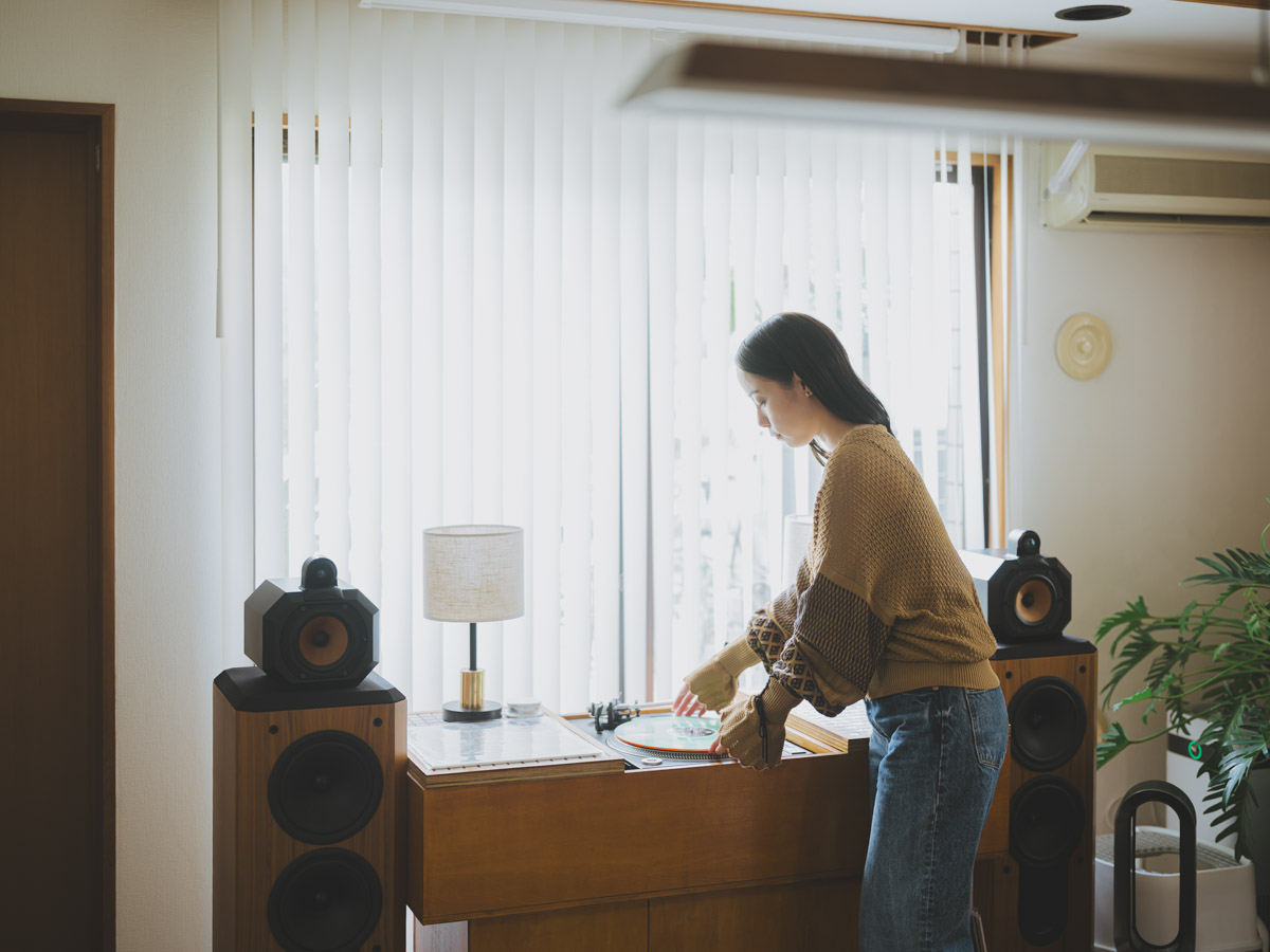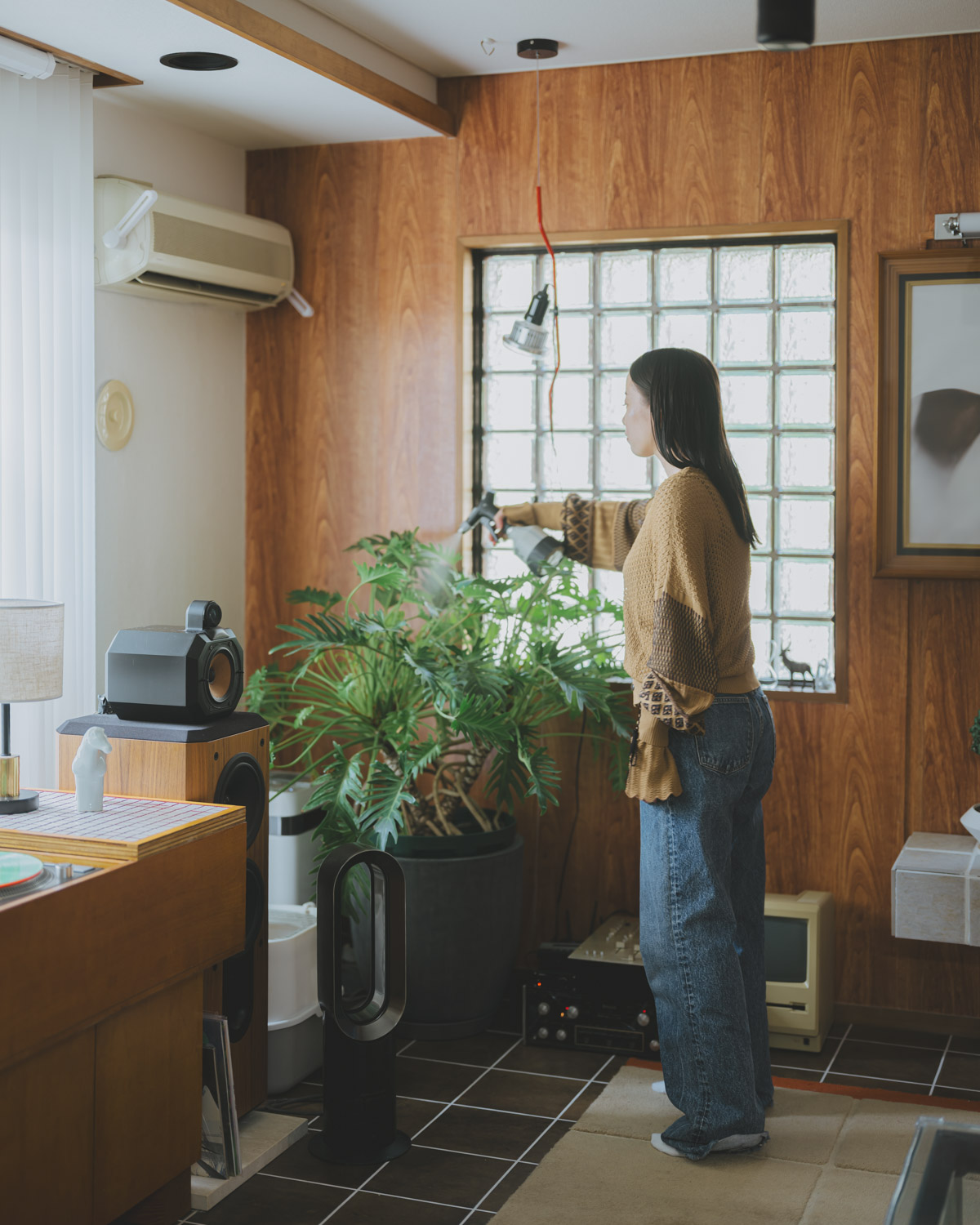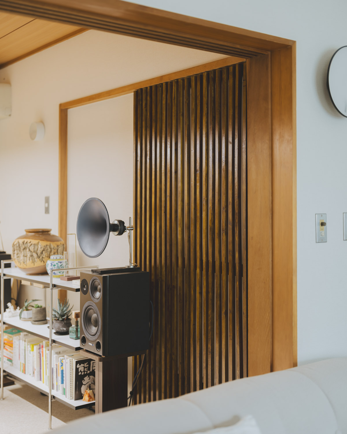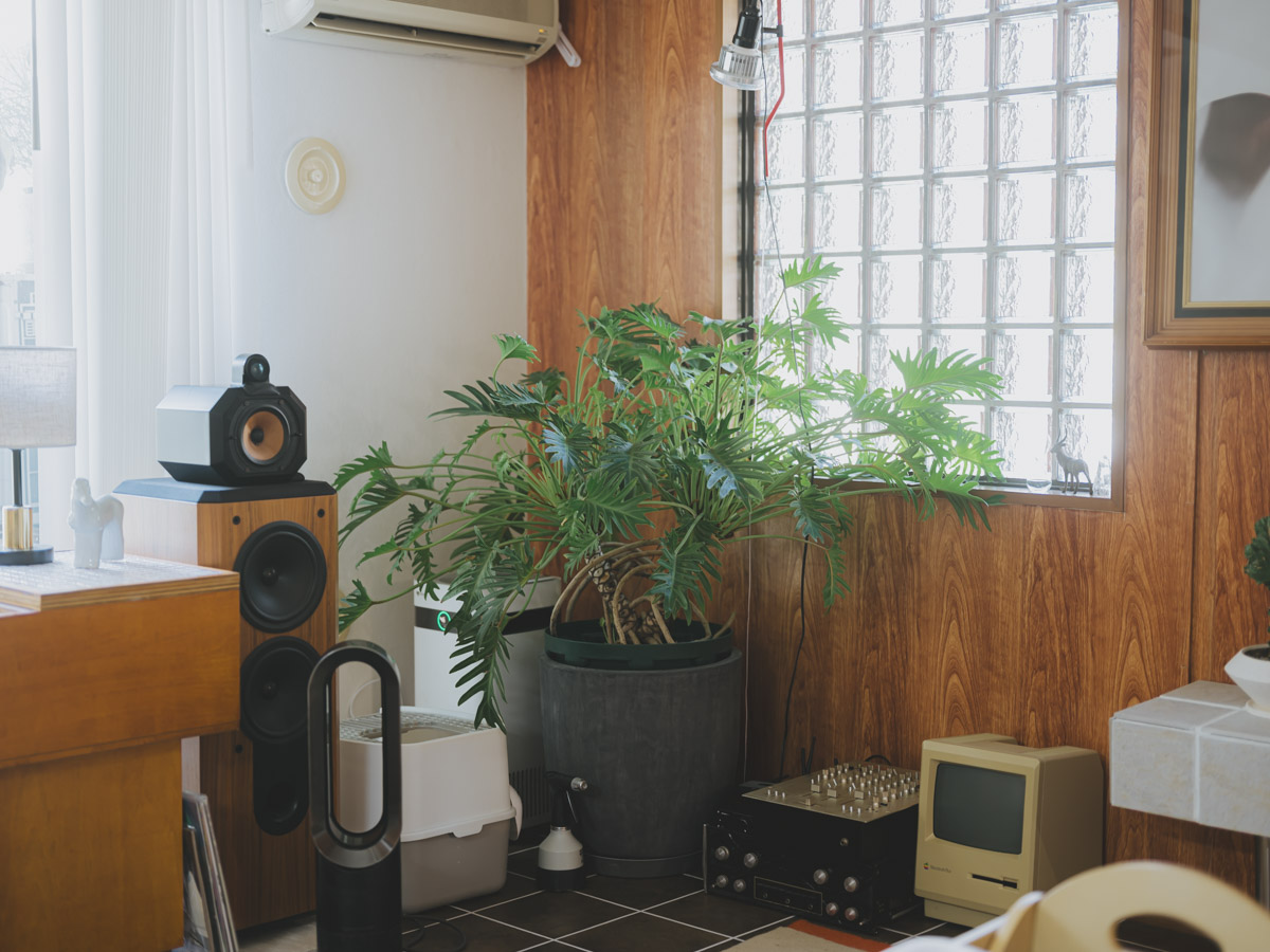 以前はレコード棚の上に植物をたくさん置いていたそうですが、「少しごちゃついている気がして」場所を変えたところ、しっくりきたのだとか。 お気に入りのものを並べたい気持ちと、空間の心地よさ。そのバランスを常に俯瞰して見る視点が、この洗練された空気感を生み出しています。