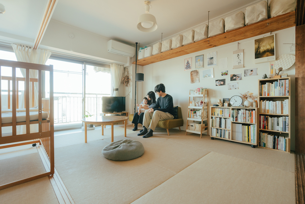 初穂さんと健太郎さん、生まれたばかりのお子さんが三人で暮らしていらっしゃるのは、約63㎡の2LDK。MUJI × UR 団地リノベーションプロジェクトのお部屋です。床には触れ心地のよい麻畳が採用されたお部屋。「全部畳でつながっているのがよくて、子どももたくさん動き回れるのでよかったと思っています」
