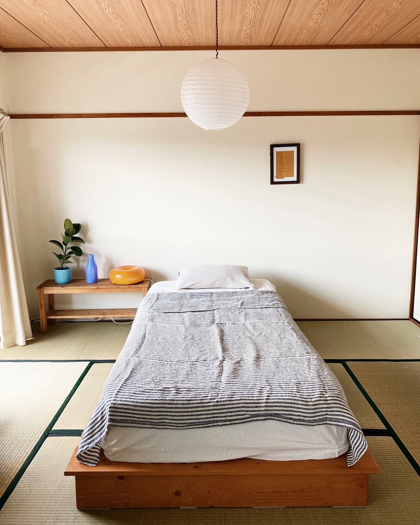 uucchhiiさんが一人暮らしをしていらっしゃるのは築40年ほどの49㎡の2LDK。転勤でお引越しをするにあたり、和と洋をミックスさせたお部屋にしたいと、和室があるお部屋を探されていたのだそう。和室には真ん中にすのこベッドを置いて、和と洋をミックスさせたベッドルーム空間に。リビングでソファに座ったとき正面に見えて、お気に入りの空間を見ながら安らげるのだそう。