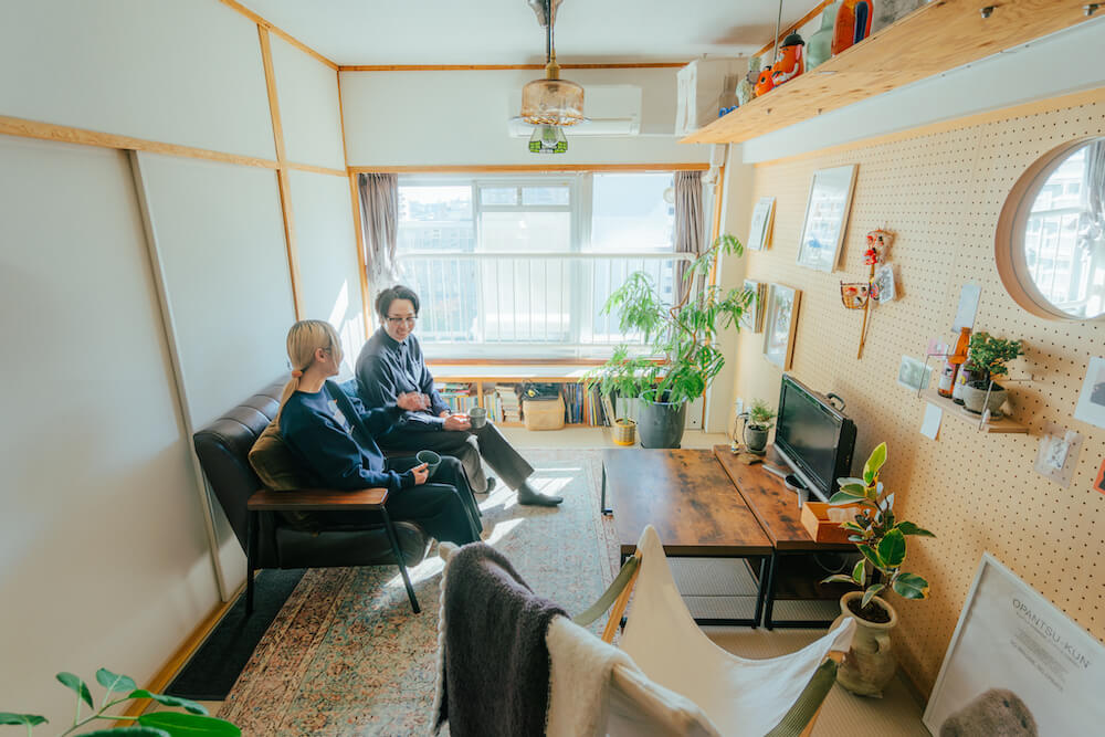 ネイリストのハルナさんとパートナーのヨウヘイさんが二人暮らしをしていらっしゃるのは、47㎡ほどの1LDK。築57年のUR賃貸住宅のリノベーションされたお部屋です。リビング・ダイニングの床には麻畳が使われ、なかなか大胆なリノベーションがされています。ハルナさんたちは、ラグを使ってゆるく空間を仕切ることで上手に使われていました。