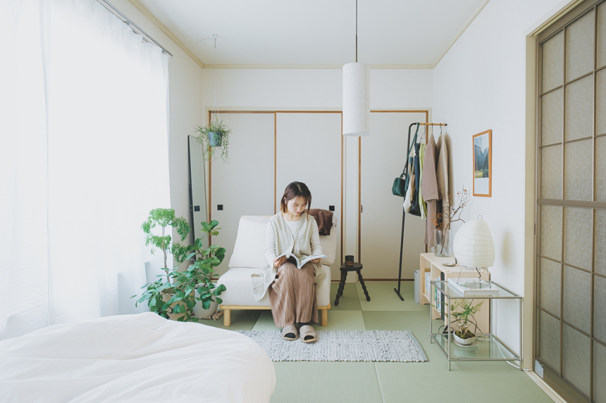 ふくさんが一人暮らしをしていらっしゃるのは、41㎡の2DK。築50年ほどのUR賃貸住宅で、住棟間が離れていて日当たりもよく、南北に部屋がつながっているためふすまを開けておけば風も抜け、気持ちのよいお部屋です。「ベッドではなく布団で寝たかったのもあり、畳の部屋はあったらいいな、と思っていました。冬も床が冷たくないので気持ちよく過ごせます」