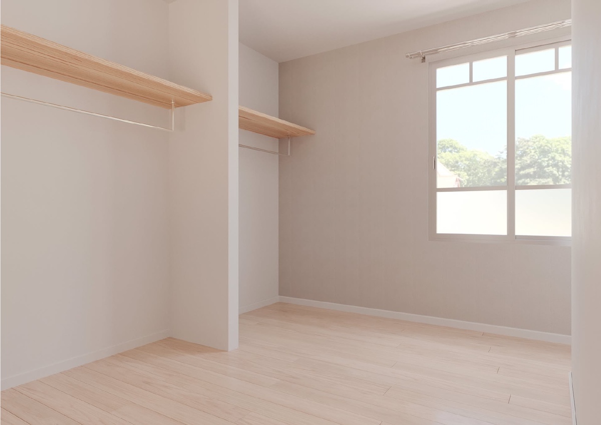 約10帖のLDKと独立した約4帖の寝室は、天然無垢のフローリングを採用。白を基調とした明るくシンプルな内装です。2つの部屋の間にはアーチ開口を取り入れ、空間をやわらかくつなぎます。
