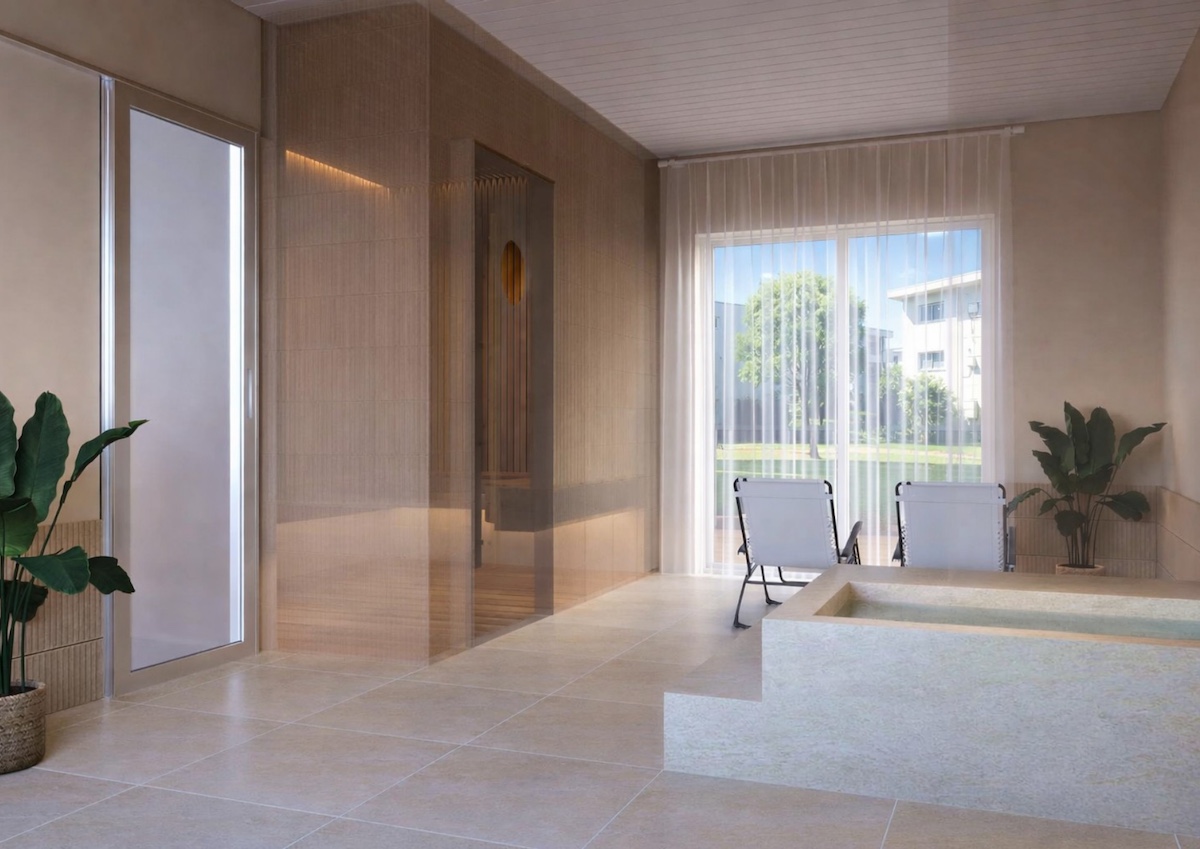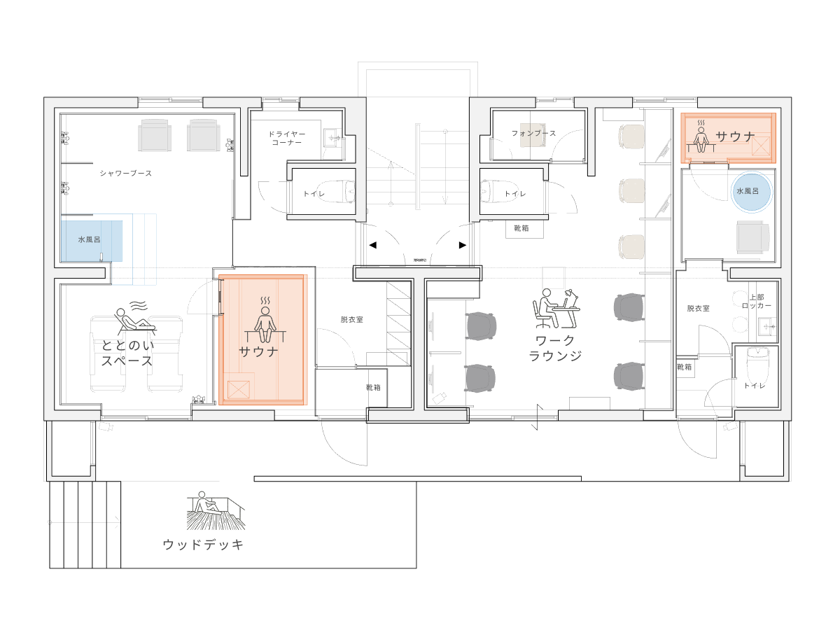 こちらの拠点にも、サウナ、大浴場、ワークラウンジ、そしてフィットネススペースがありますよ。