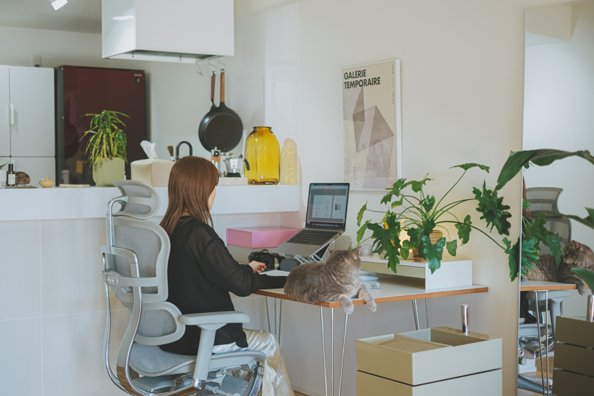 「仕事と食事をするところと分けたくて、ダイニングテーブルと別にテーブルも置ける広さの住まいになってことに合わせて新しくワークスペースを作っています。リモートワークが続いていたので、思い切ってスペックの良いデスクチェアも新調し、かなりお気に入りの空間になっています」(このお部屋はこちら)