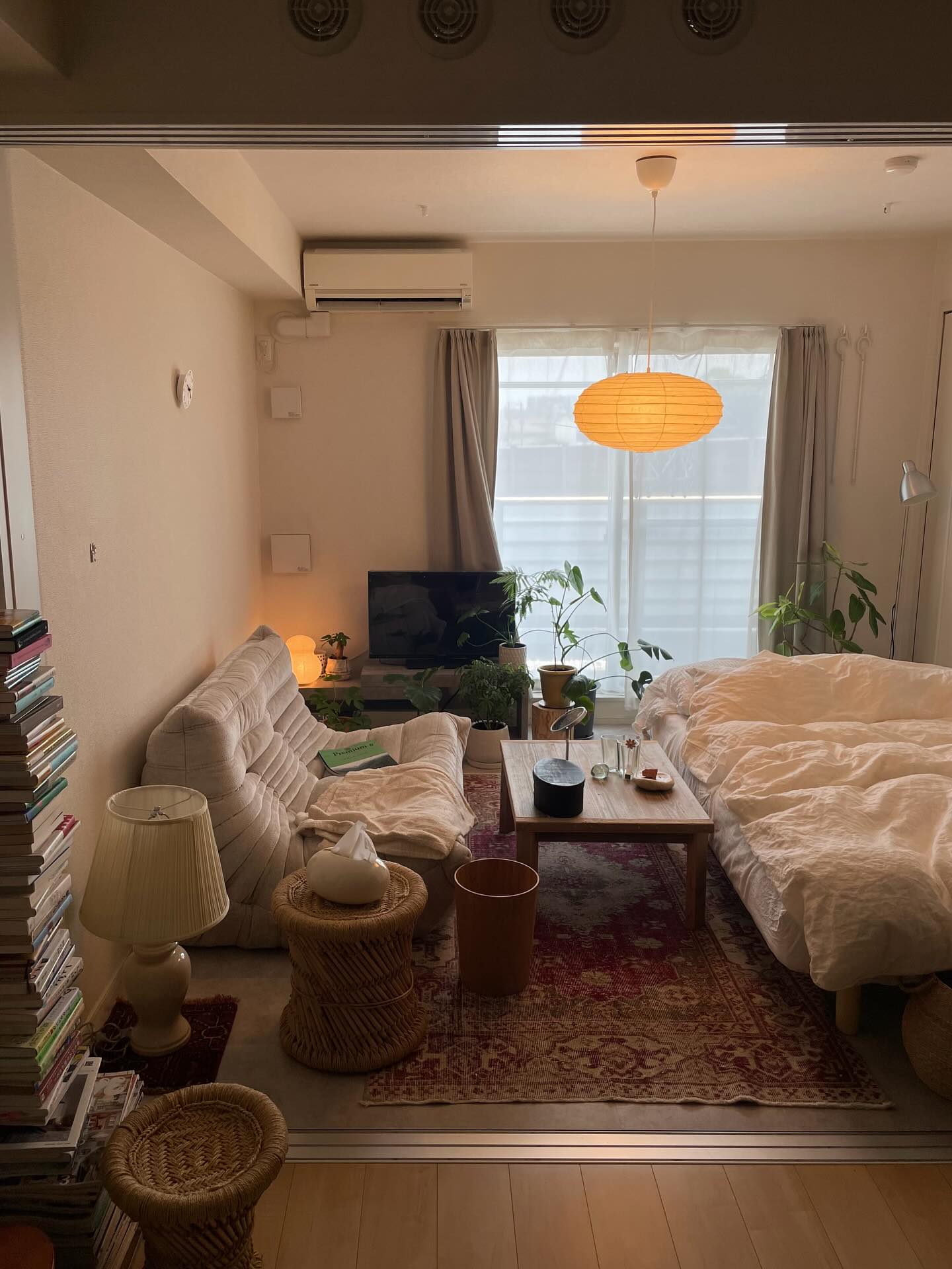 イサムノグチの AKARI は、買ってよかったアイテム。じつは、もうひとつ似ている別の照明を買ってみたものの、本物と比べると和紙の色味や質感が全く違っていて、あらためて AKARI に買い替えたほど、絶妙な日本らしい素材感が気に入っているそう。(このお部屋はこちら)