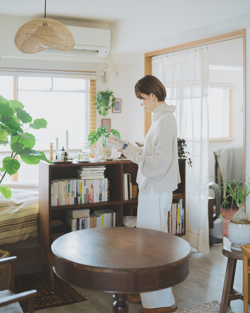 ヴィンテージ家具に囲まれたお部屋をつくるきっかけになったという、ブックシェルフ。 「前までは結構ナチュラルテイストな部屋でした。きっかけになったのは本棚の買い替えです。WANT ANTIQUEで偶然見つけたこのブックシェルフをきっかけに惹かれて取り入れると、他の家具も一気に変えることにしました。」(このお部屋はこちら)