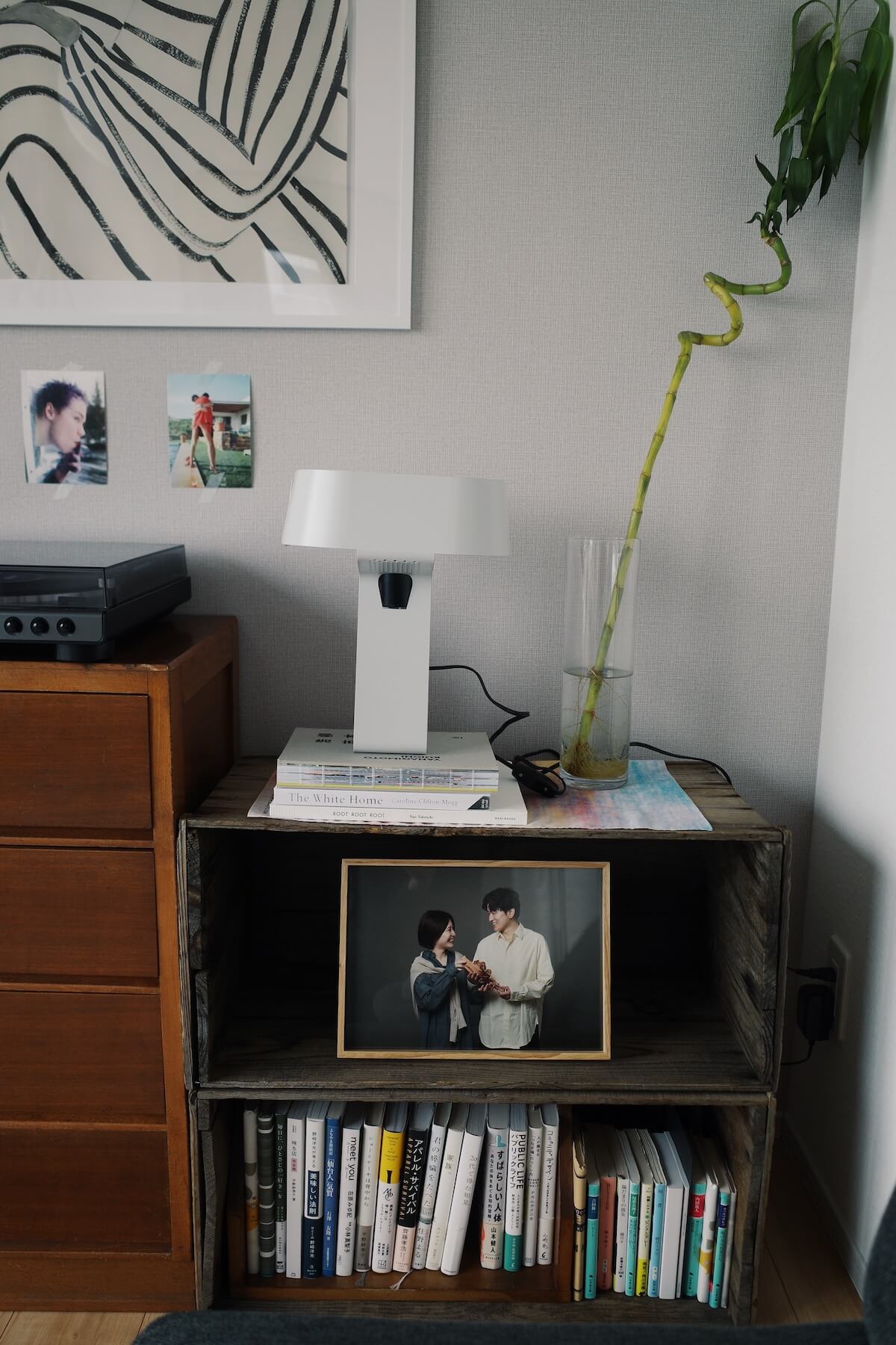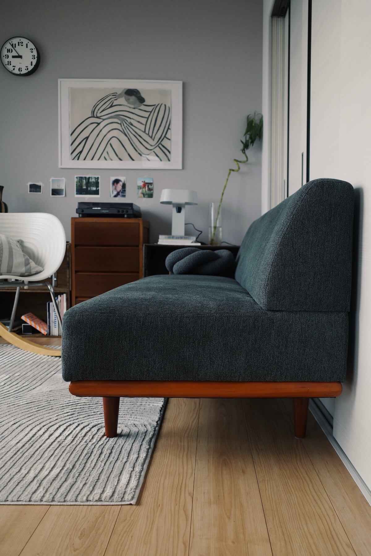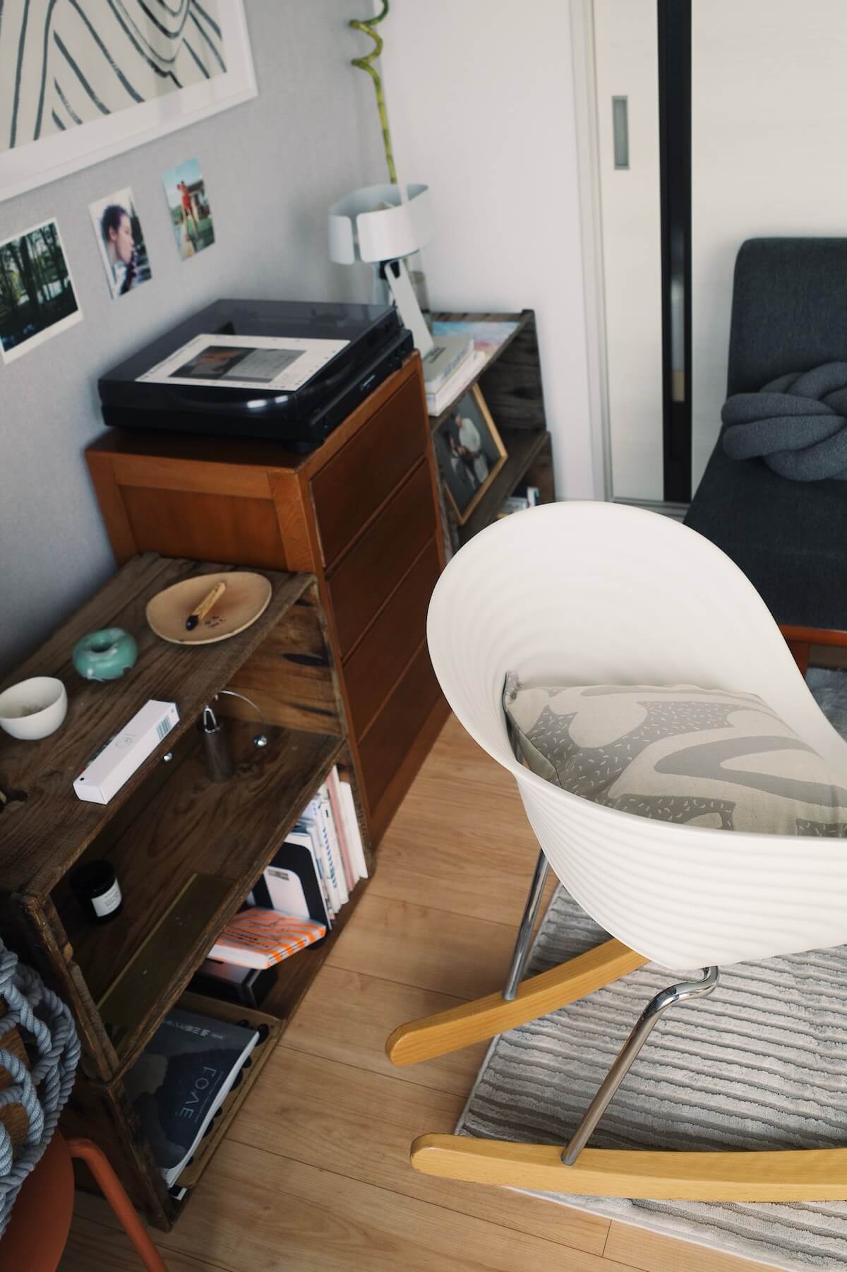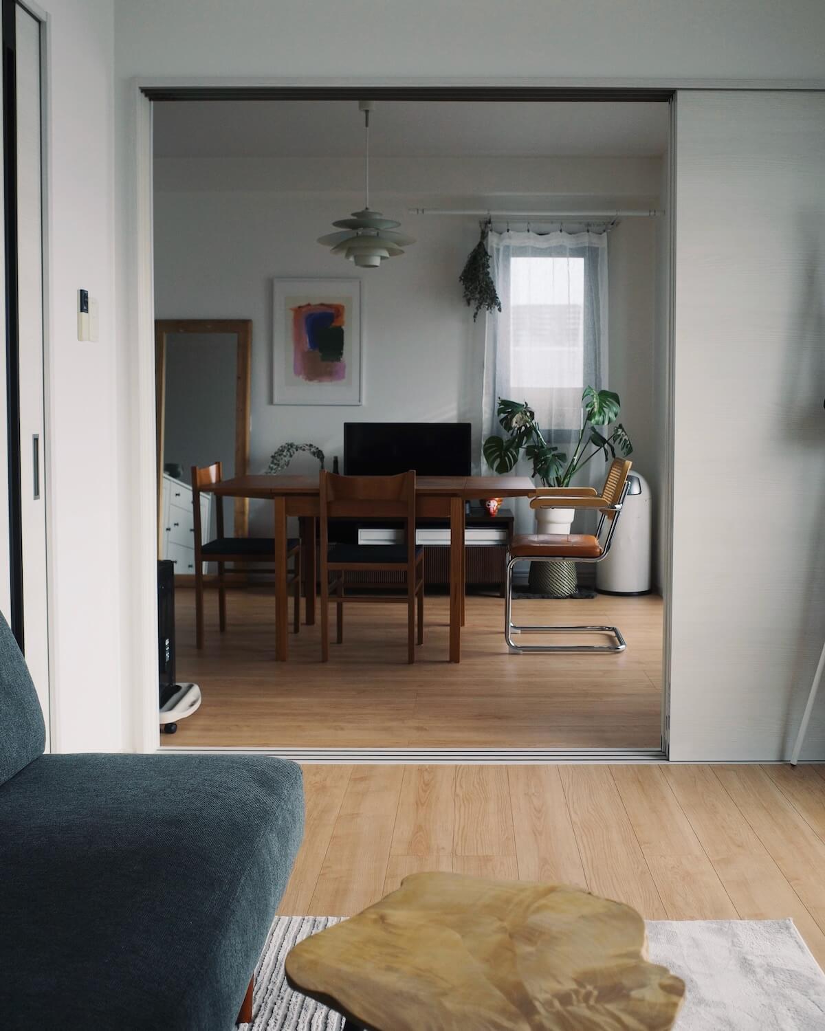 余白を大切にしながら、デンマークのダイニングテーブルや照明、アートなど、北欧のアイテムですっきりとまとめたリビングダイニング。本やレコードに囲まれ、落ち着いてゆったりと過ごすことができそうな、二人暮らしの2LDKを拝見しました。
