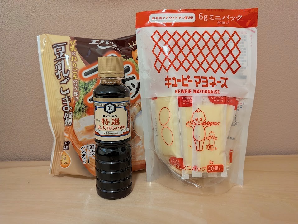 調味料は、100円ショップで売っているミニサイズのボトルや、1回分ずつ分かれたポーションタイプ(鍋の素やドレッシングなど)のみを購入します。「1ヶ月の滞在で使い切れる量」が基準です。