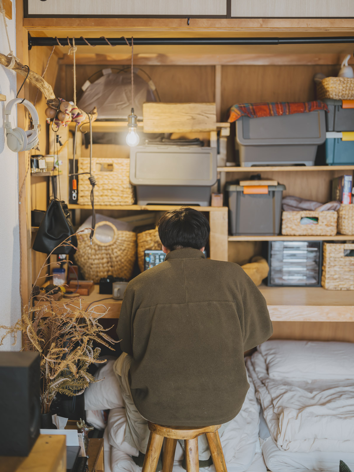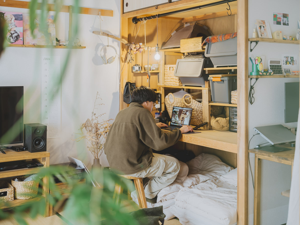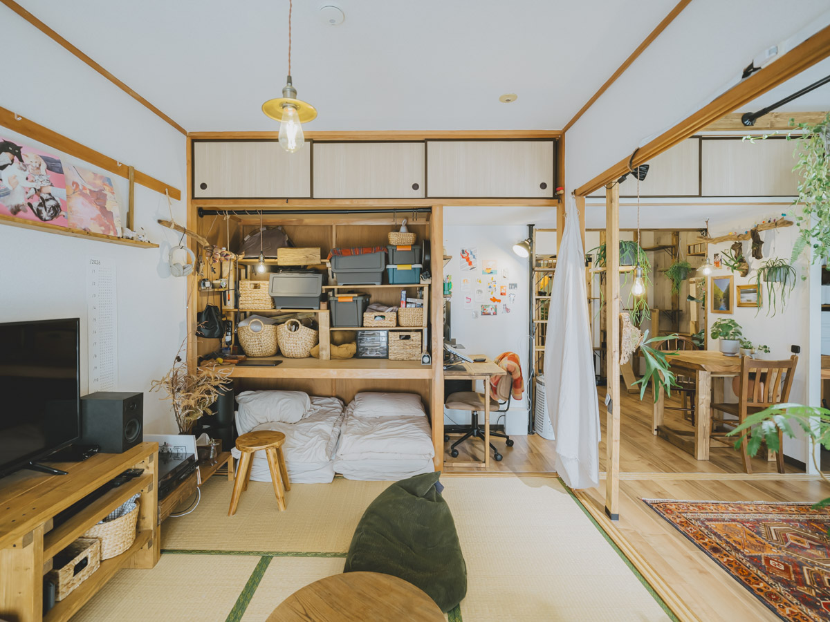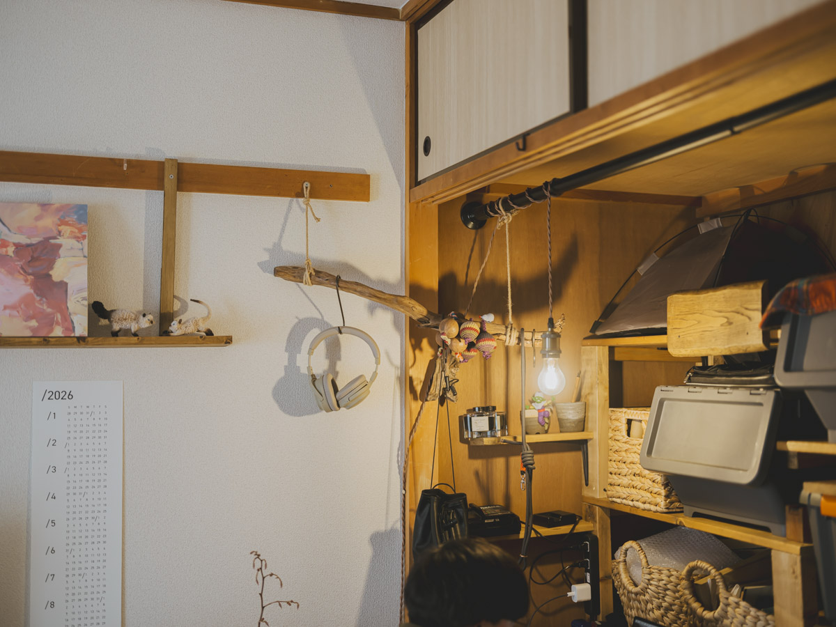 「昼過ぎになるとよく日が差し込む和室は、猫と一緒に日向ぼっこをする私の一番好きな時間です。和室にある大きな押し入れは、扉を取り払って収納兼デスクのように使い、その下のスペースに敷布団をしまっています。夜はその布団を出して和室で寝ているので、一日の中で一番長く過ごしている、我が家の中心的な場所になっています」