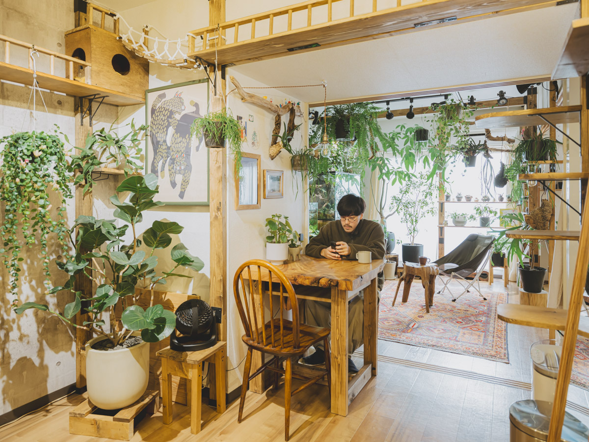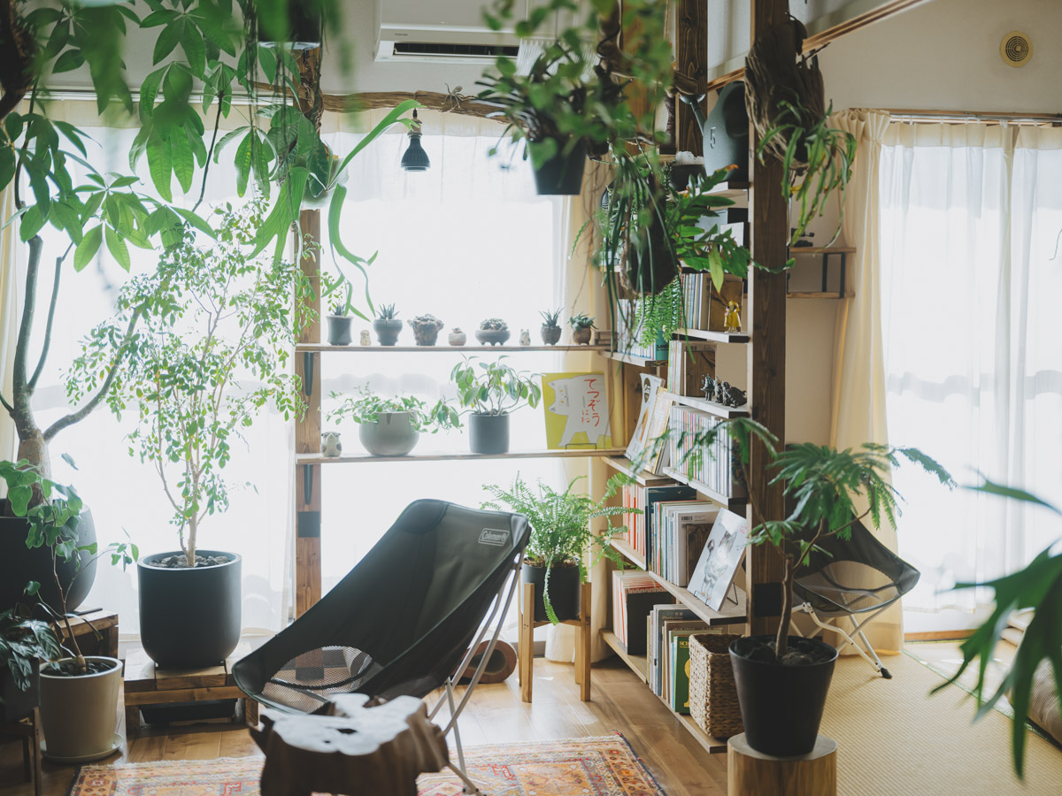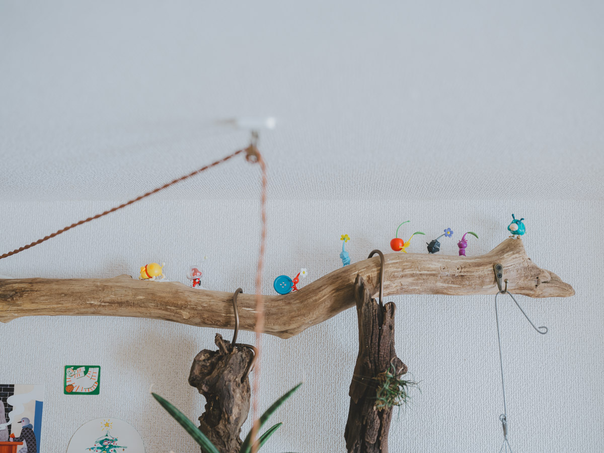 お部屋に足を踏み入れると目を奪われるのが、生き生きとした無数の植物たちと、随所に配置された流木です。地元も自然豊かな環境で育ったこのやさんは、大学生の頃から部屋に植物を置き始め、前職では大型園芸店で5年間スタッフとして働くほど、植物への深い愛情を持っています。