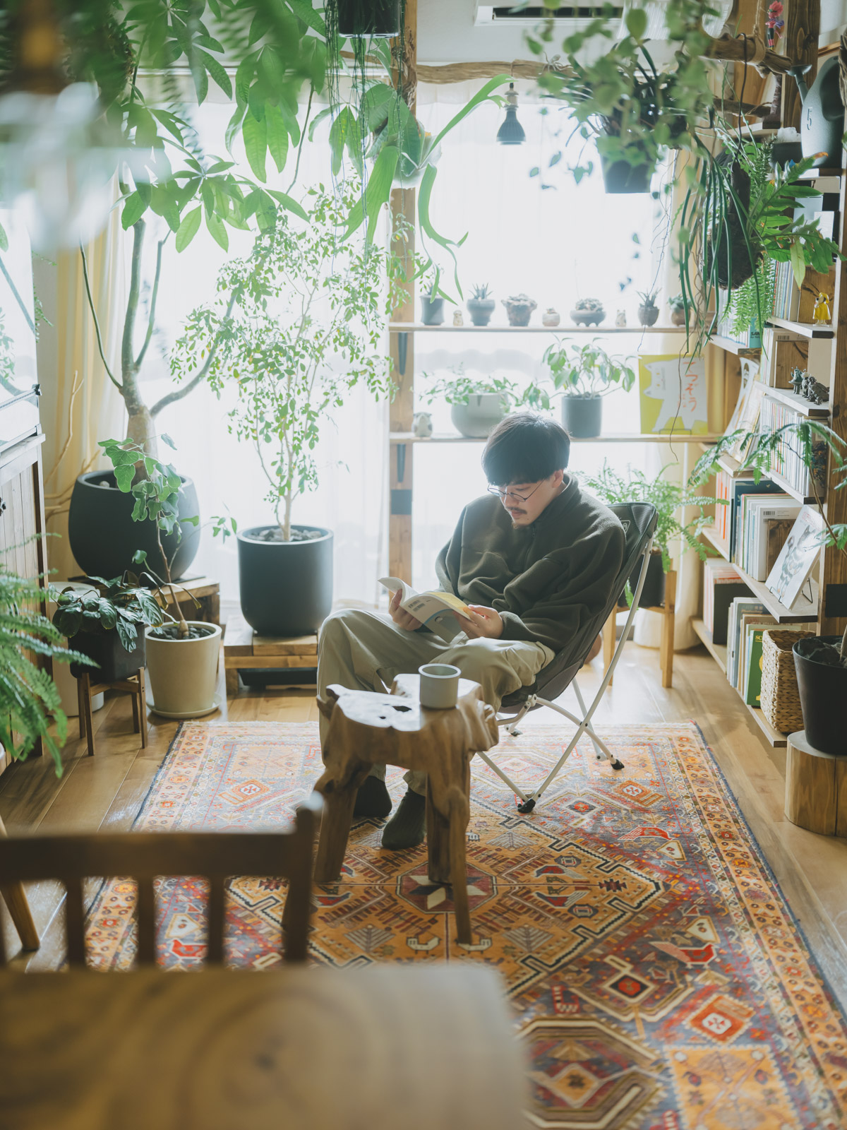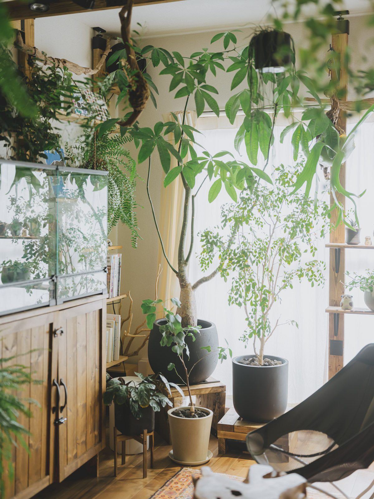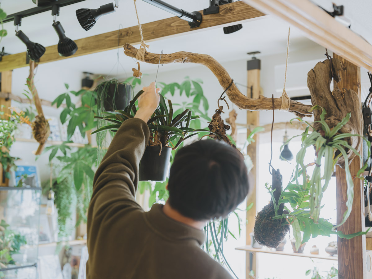 お部屋に足を踏み入れると目を奪われるのが、生き生きとした無数の植物たちと、随所に配置された流木です。地元も自然豊かな環境で育ったこのやさんは、大学生の頃から部屋に植物を置き始め、前職では大型園芸店で5年間スタッフとして働くほど、植物への深い愛情を持っています。