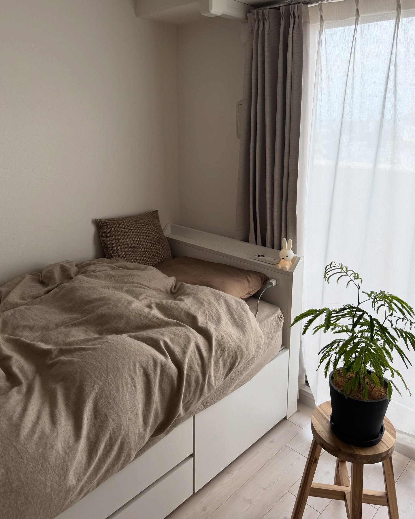 賃貸の小さな8畳1K。ベージュの濃淡で家具やファブリックの色を統一し、収納の工夫ですっきりと住みこなす、初めての一人暮らしのお部屋を拝見しました。