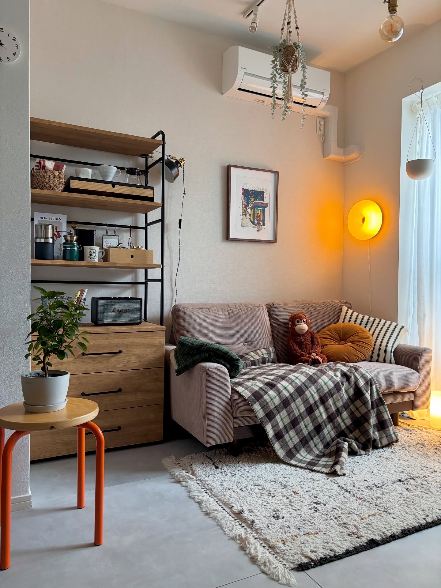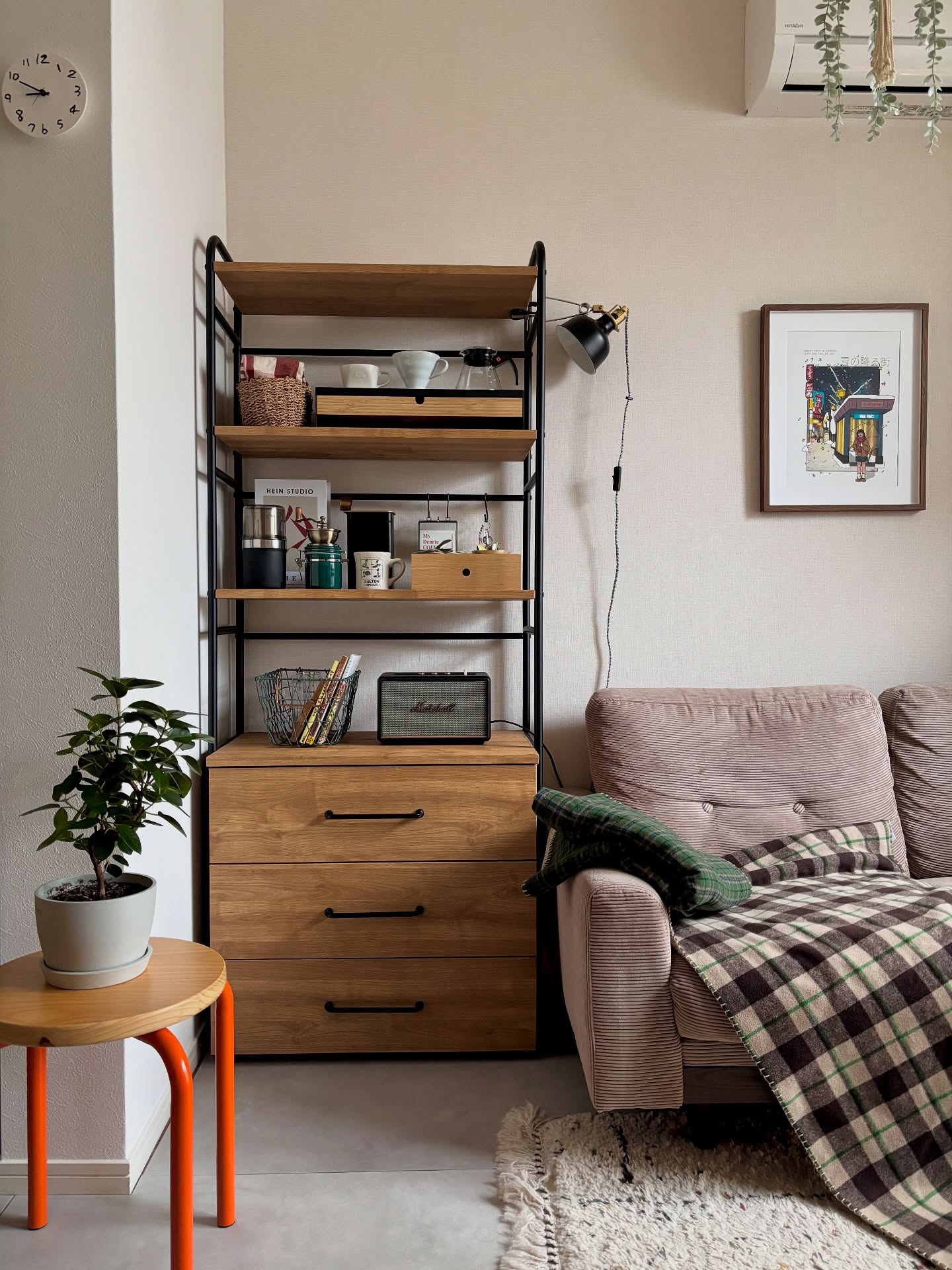 自分のふだんのキャラクターやファッションとも雰囲気が合うような、等身大のインテリアを意識していると mii さん。カフェのインテリアからインスピレーションを得ながら、あたたかみのある雰囲気の空間をつくられています。