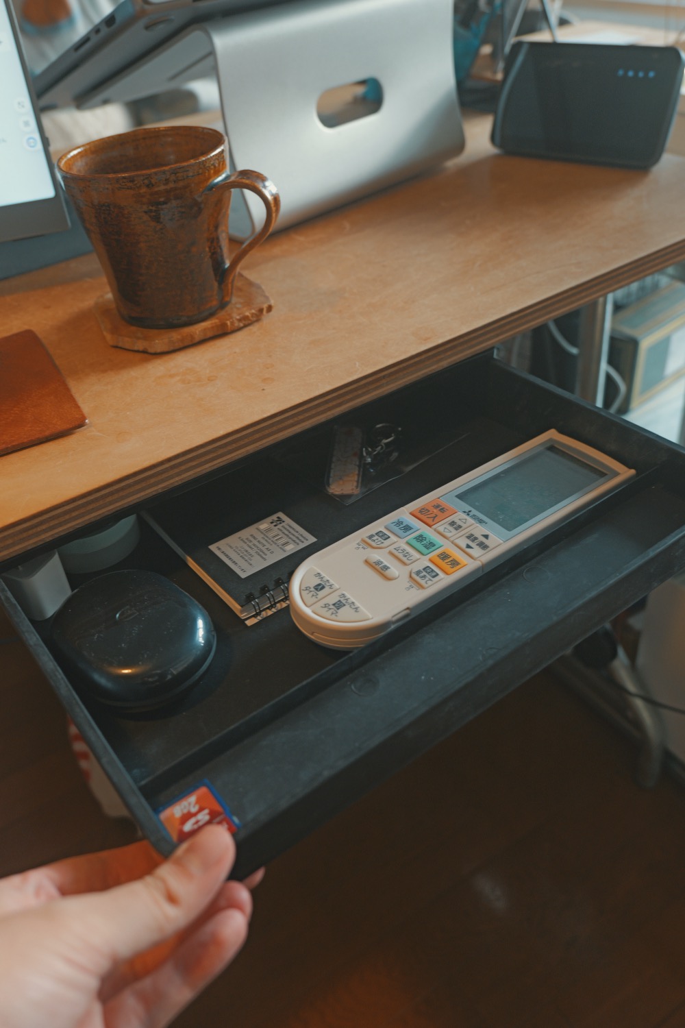 まずご紹介したいのは、引き出しがないデスクに後付けで引き出しを追加できる優れもの。両面テープが貼れる場所ならどこにでも取り付け可能で、省スペースで引き出しを追加できるところが使い勝手が良いです。