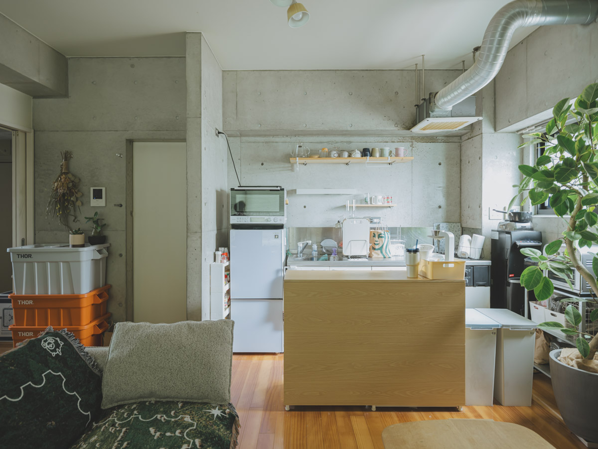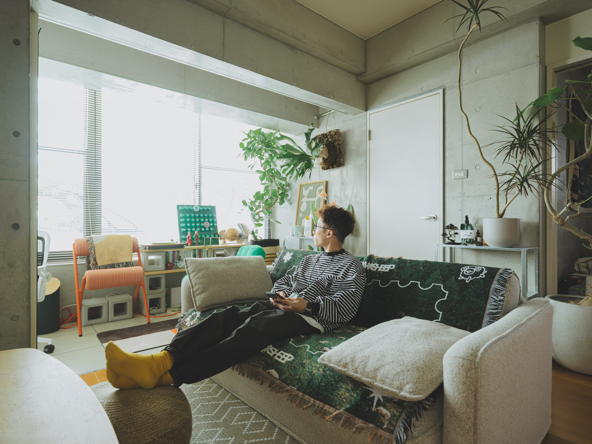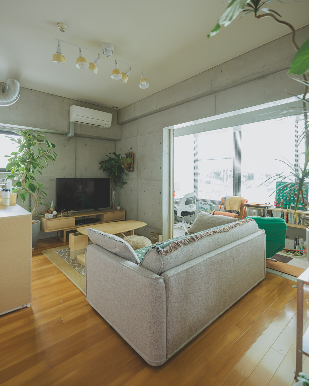 無機質なコンクリートの壁に、生命力溢れる植物のグリーンが映える。 そんなコントラストが美しい2LDKの部屋で暮らすのは、植物関連の会社を営むペドロさん。 「寝るだけ」だった生活から、「暮らしを楽しむ」生活へ。 物件との出会いによって変化したライフスタイルと、空間使いの工夫についてお話を伺いました。