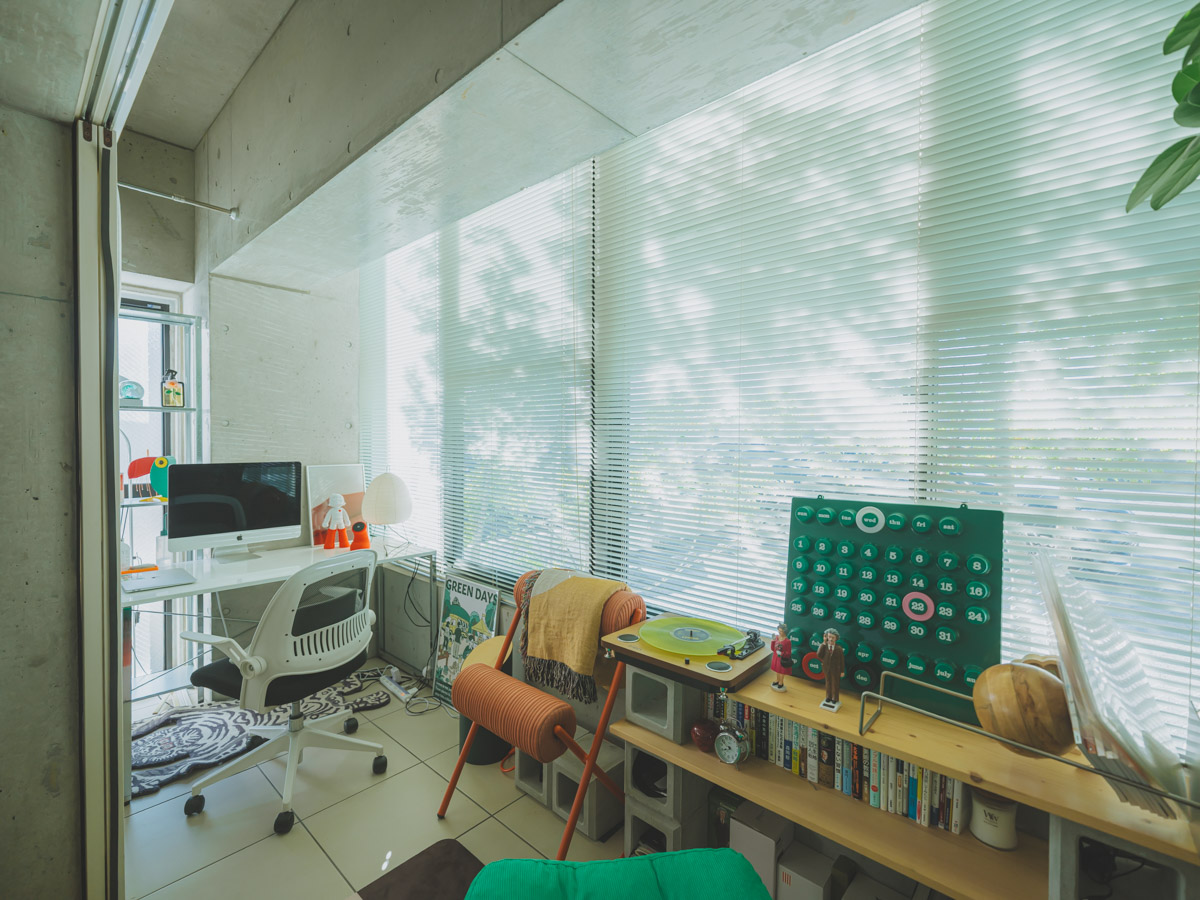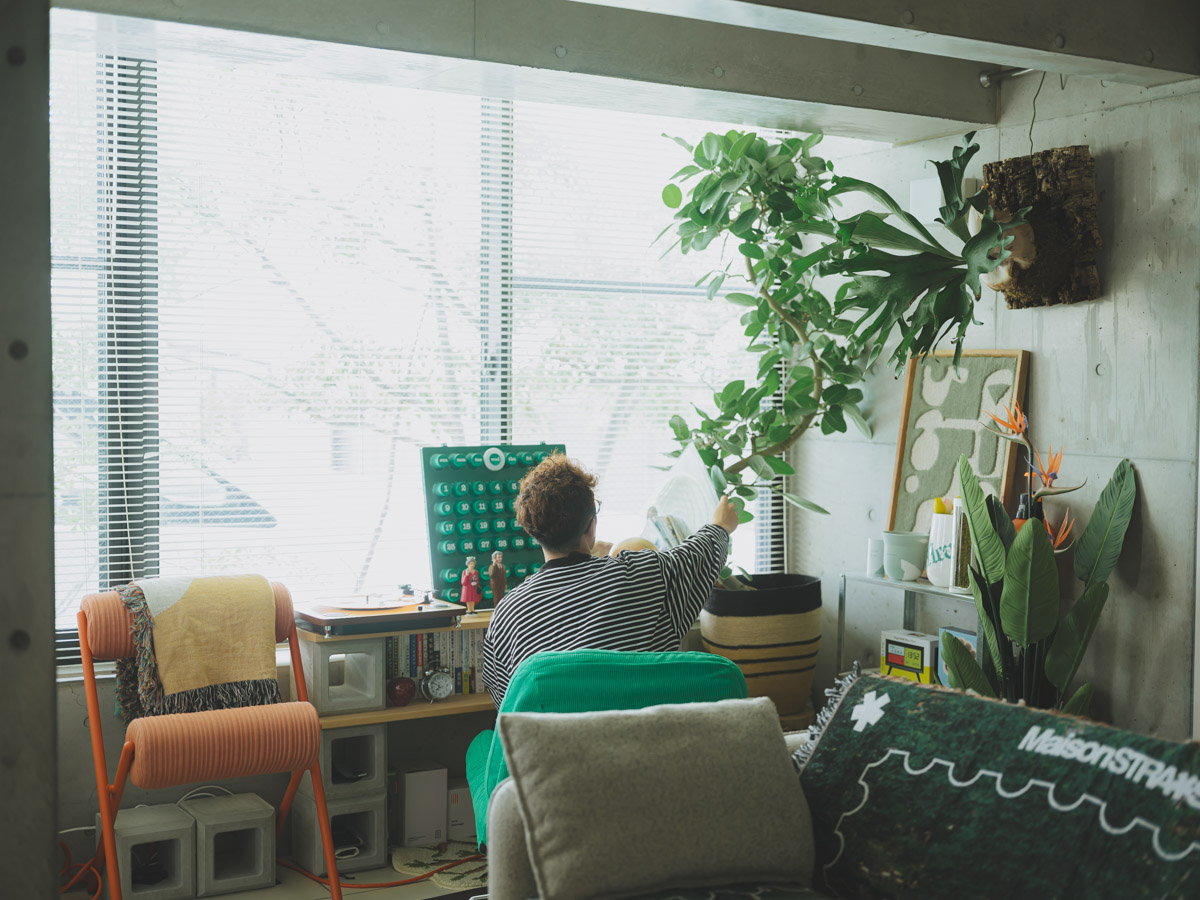 コンクリートの冷たさと、植物や愛着のある家具の温かさ。 そして、計算された「見せる」演出と、自身がリラックスするための「隠す」機能。