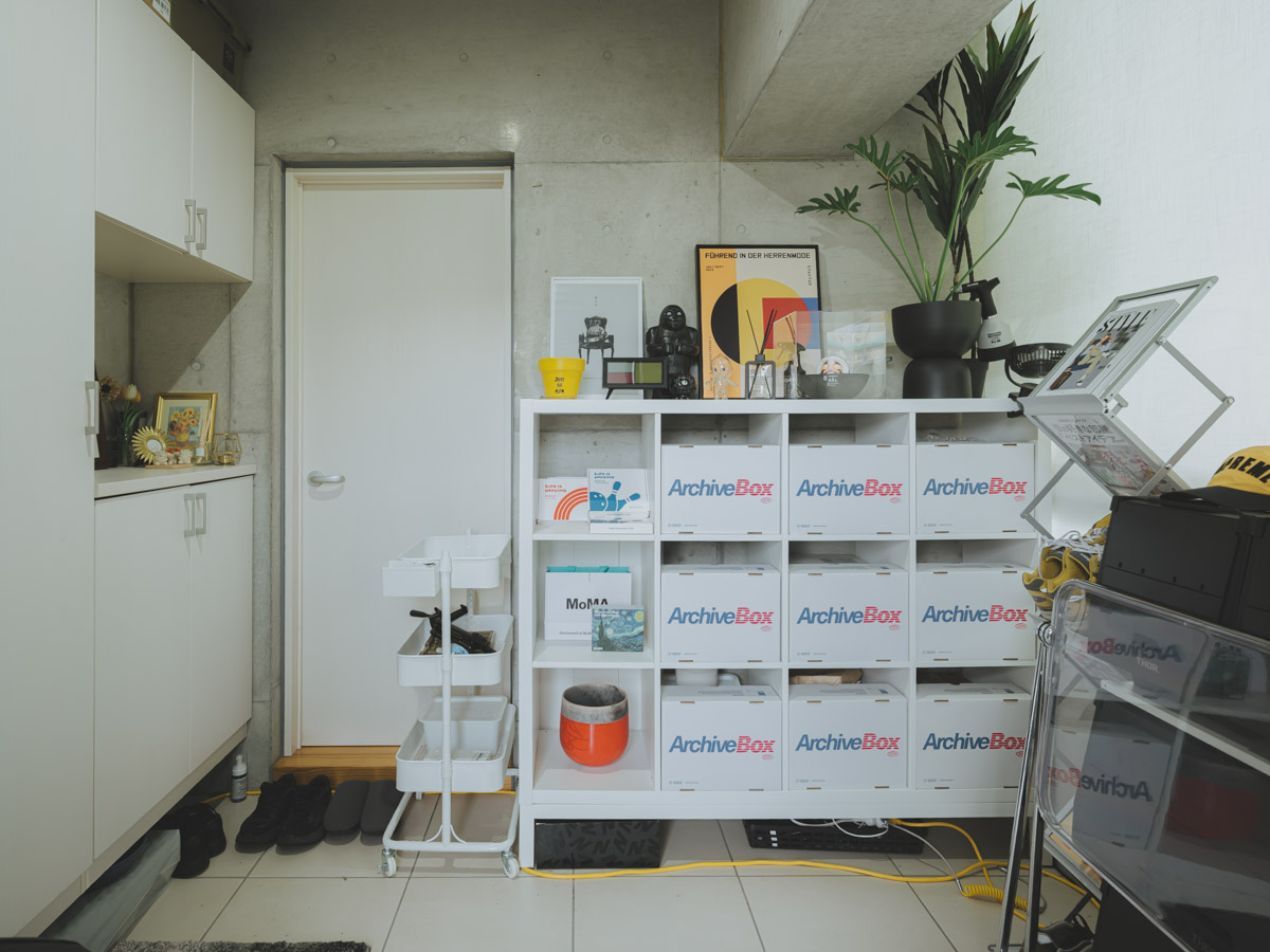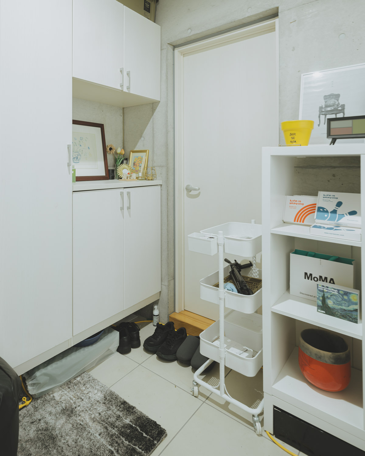 この部屋を訪れた人がまず驚くのが、通常の賃貸物件では考えられないほど広く取られた「玄関土間」の存在です。 コンクリートの床が奥まで続くその空間は、単なる通路と呼ぶにはあまりに贅沢な広さ。 「最初は『そんなに広さいる?』と思いました(笑)。でも、この余白こそがこの部屋の面白さだと思ったんです」