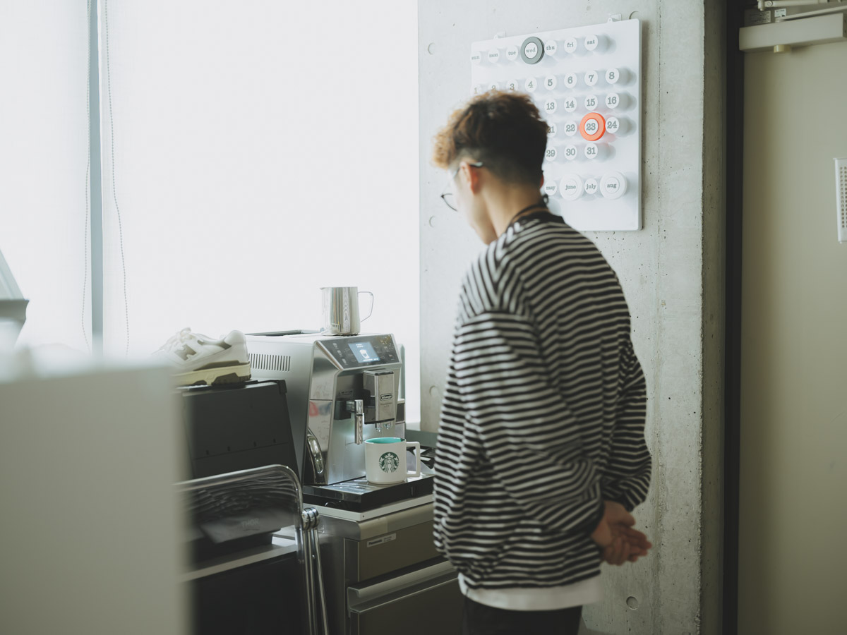 来客時にはここがウェルカムスペースとなり、ドアを開けた瞬間からコーヒーの香りでゲストを迎える。 「あえて生活の機能を分散させることで、家全体をくまなく使えるようになりました」 既成概念にとらわれないペドロさんの自由な発想が、このデザイナーズ物件のポテンシャルを最大限に引き出しています。