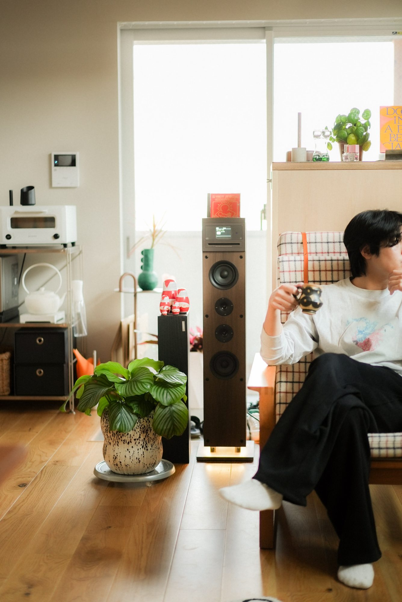 初めに紹介したいのは、迫力あるサウンドと多彩な機能を一台に集約したオールインワンスピーカー。オブジェのような佇まいで、置いてあるだけでも空間のアクセントになります。音が広がりすぎず、部屋全体をやさしく包むような響き方が心地いいところが気に入っています。