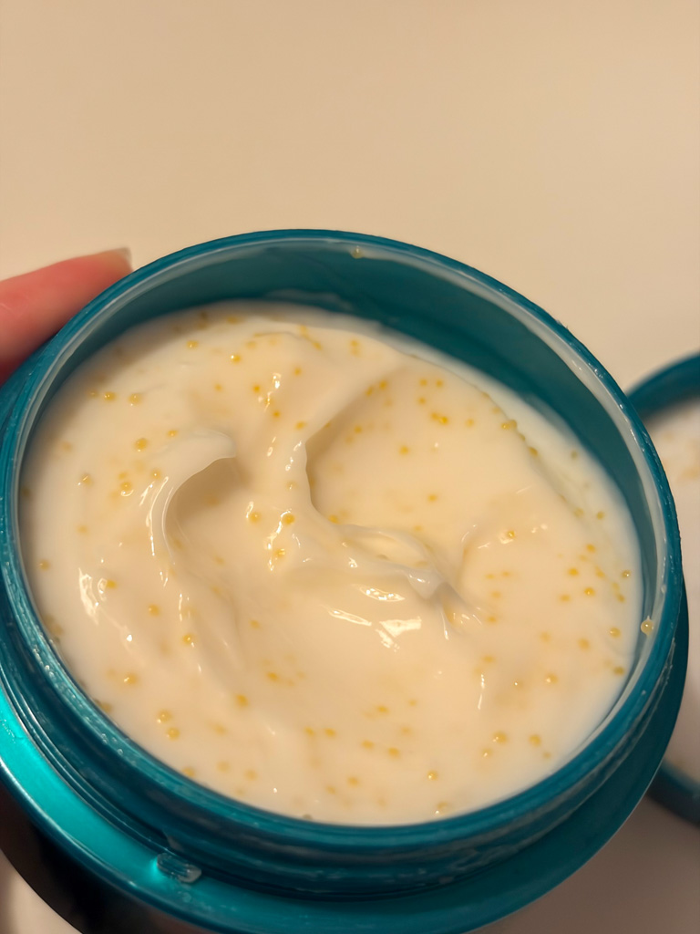 保湿力も高く、香りもクセがなく使いやすいです。中のオレンジのつぶつぶも、慣れるとクセになります。数日使った後はハンドモデルになったかと思うほどつるすべになりますよ。