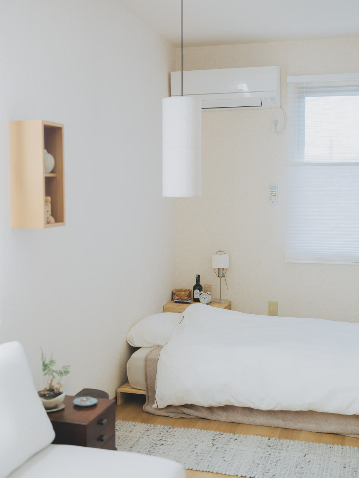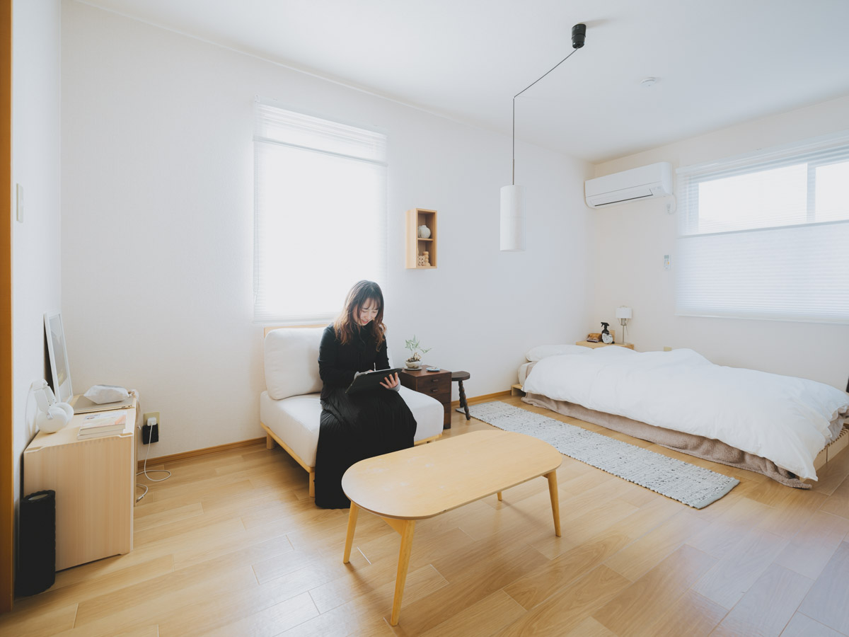3LDKという間取りを活かし、野田さんが自分だけの聖域として作り上げたのが「個室兼寝室」です。 「彼はフィギュアやアニメグッズをたくさん持っているタイプなので、彼の部屋はクローゼットも活用してコレクションを詰め込んだ空間になっています。逆に私の部屋は、ウッドと布素材をメインにした、和の雰囲気も漂う落ち着きのあるナチュラル空間を目指しました」。