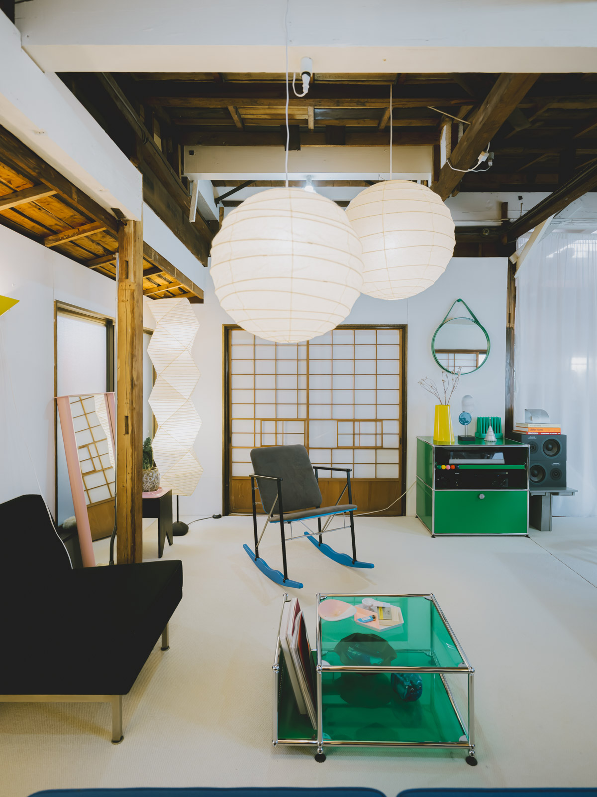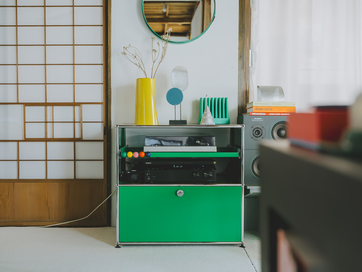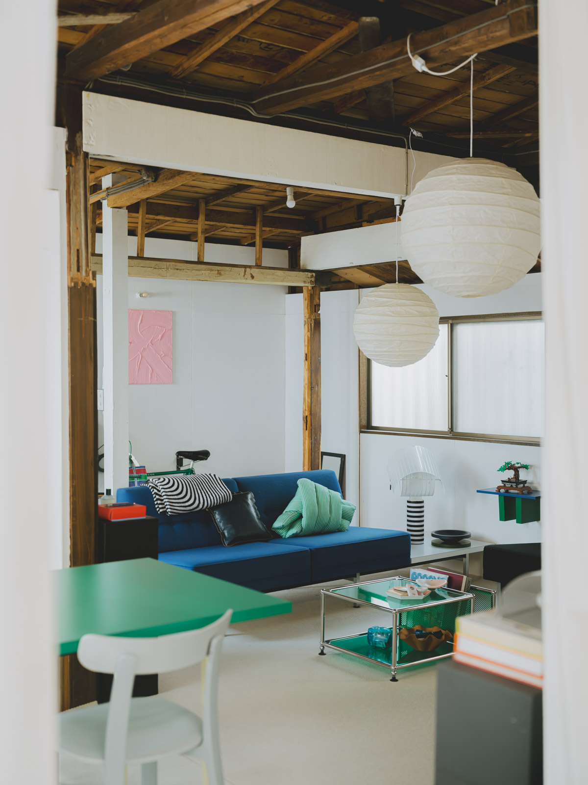 レトロな日本家屋の佇まいを残す戸建て賃貸。オーナーの許可を得て、自分たちの手で壁を白く塗り替え、床にはカーペットを敷き詰めることで、まるで美術館のような空間を作り上げている midoldhaus さん。名作家具のコレクターでもあるご主人が、ご夫婦で暮らす色鮮やかなお部屋を案内してくれました。