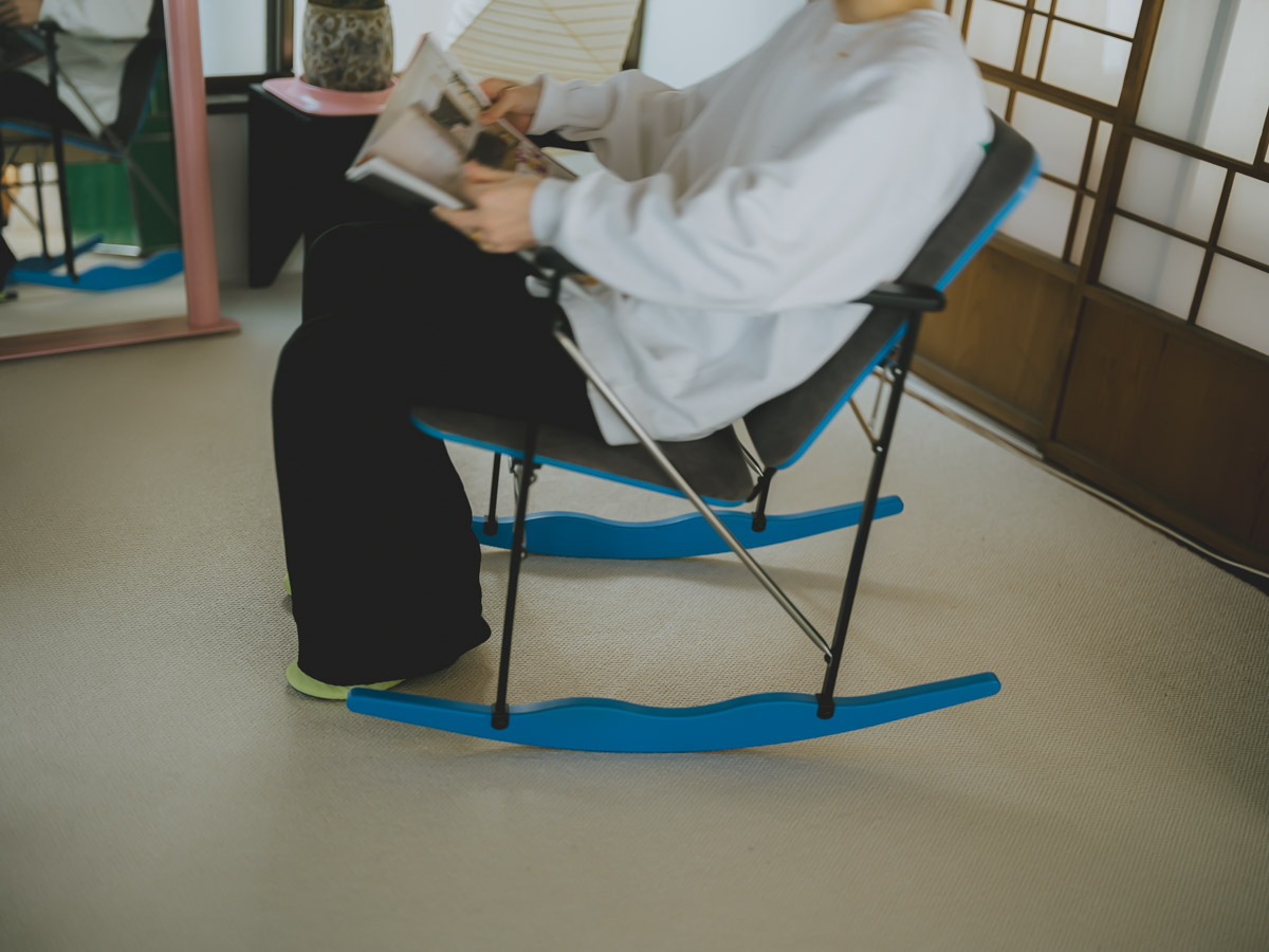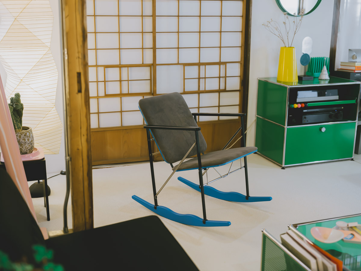 リビングで一際目を引くのが、鮮やかなブルーの脚を持つロッキングチェア。