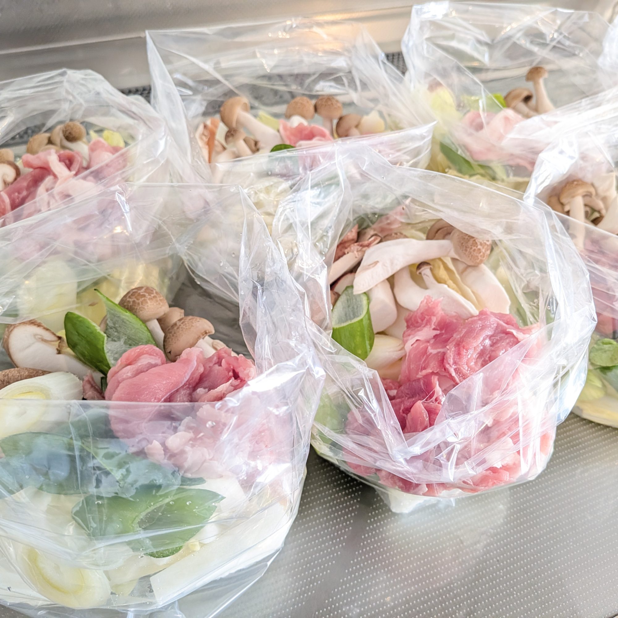 野菜・肉・キノコ類などバランスよく採れるように、食材を買ったら袋に1食分ずつ分けて冷凍しています。