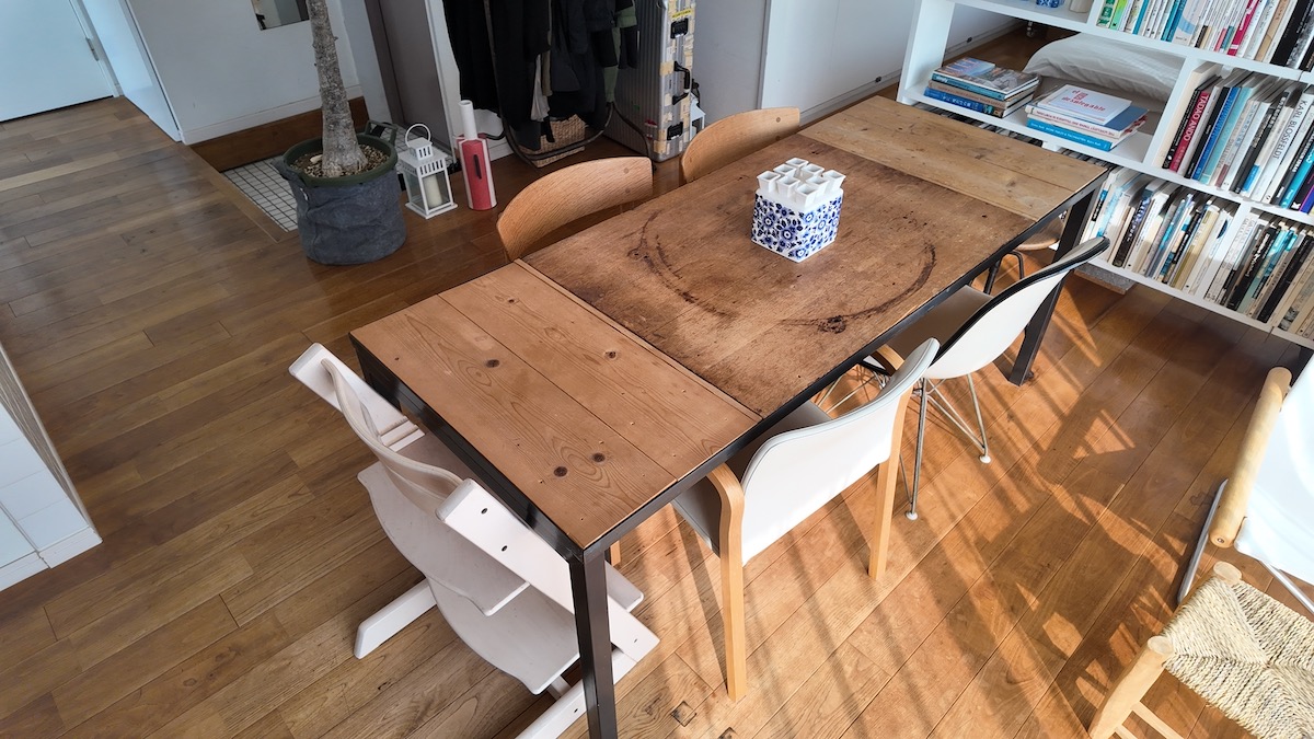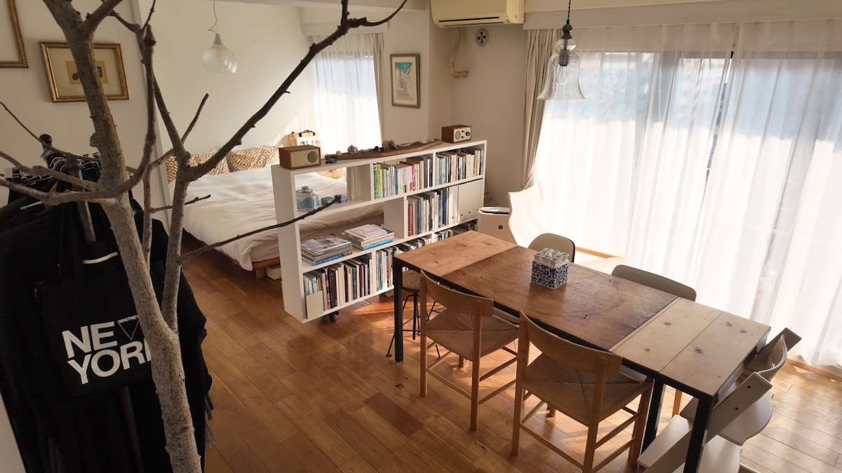 リノベーション賃貸「TOMOS(トモス)」のお部屋に、12年住んでくださっている石井さん。長く使いこむほどの愛着のわく無垢フローリングに、DIYのテーブル、経年変化を楽しめるチェアを合わせて。ぬくもりと開放感を大切にした三人暮らしのワンルームを拝見しました。